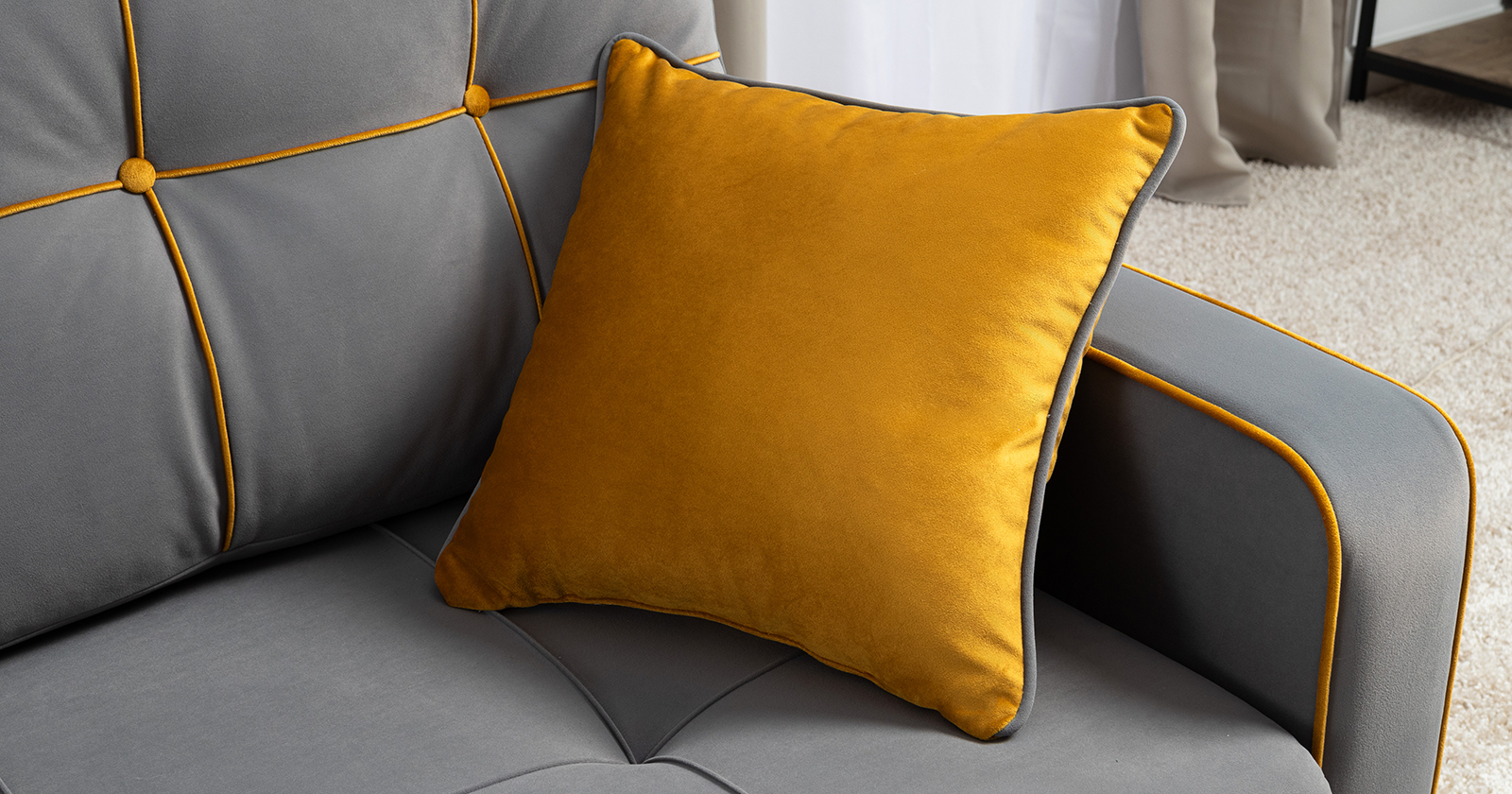 Декоративные канты на подушках и вставке подлокотников. Пуговицы в местах пересечения кантов на подушке и вставке подлокотников. По торцам подлокотников и думках контрастный декоративный кант. Защипы на сиденье и средней большой подушке.