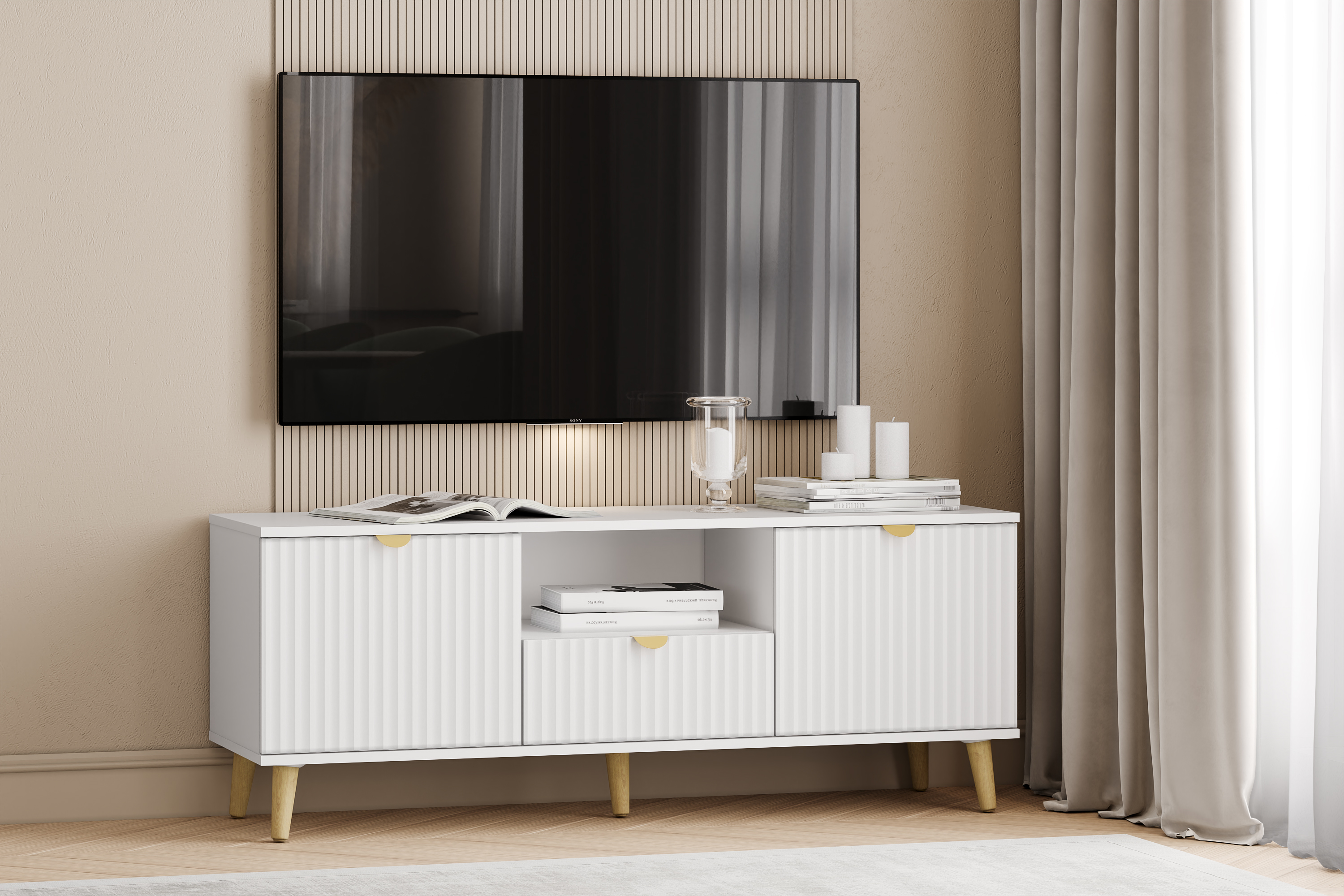 Модульная композиция включает комод и тумбу ТВА, оснащенные выдвижными ящиками, которые открываются плавно и бесшумно благодаря шариковым направляющим, а в шкафу удобно организовать книги, предметы декора или посуду, при этом высокие опоры облегчают процесс уборки.