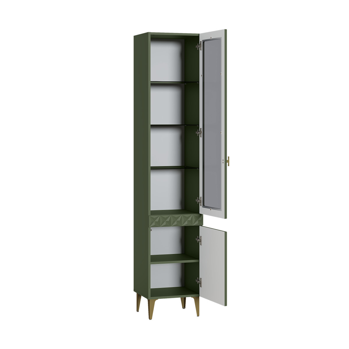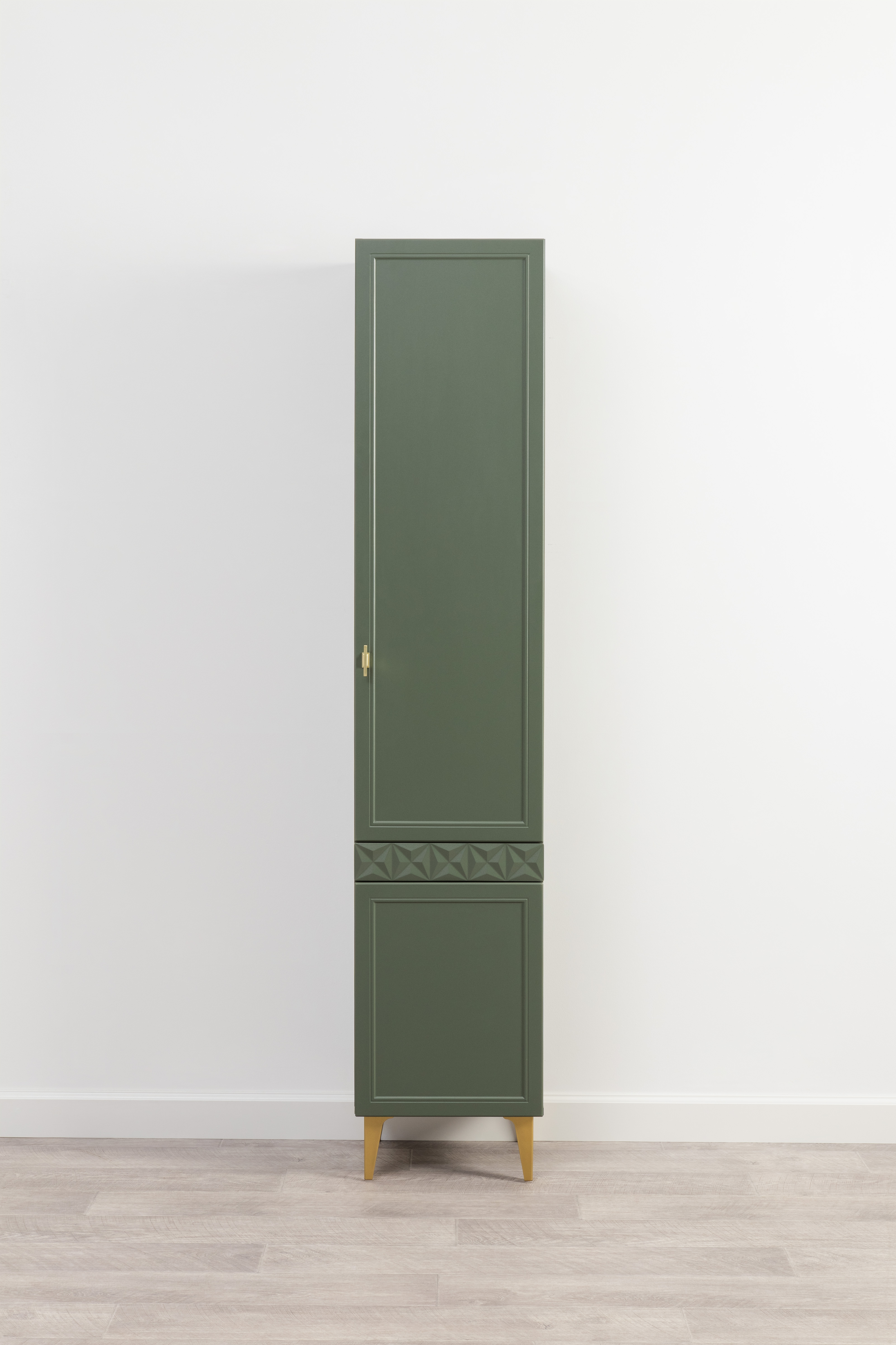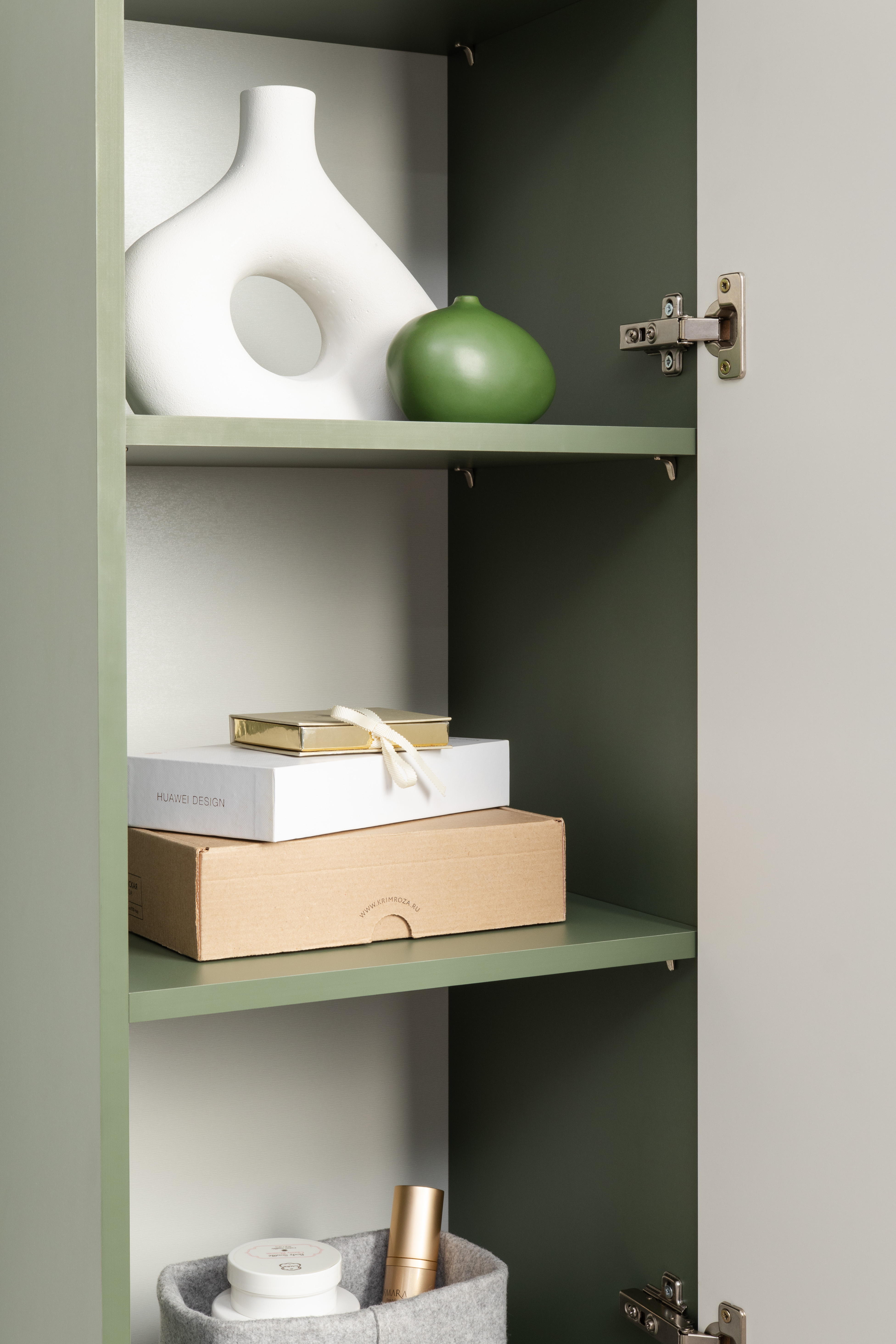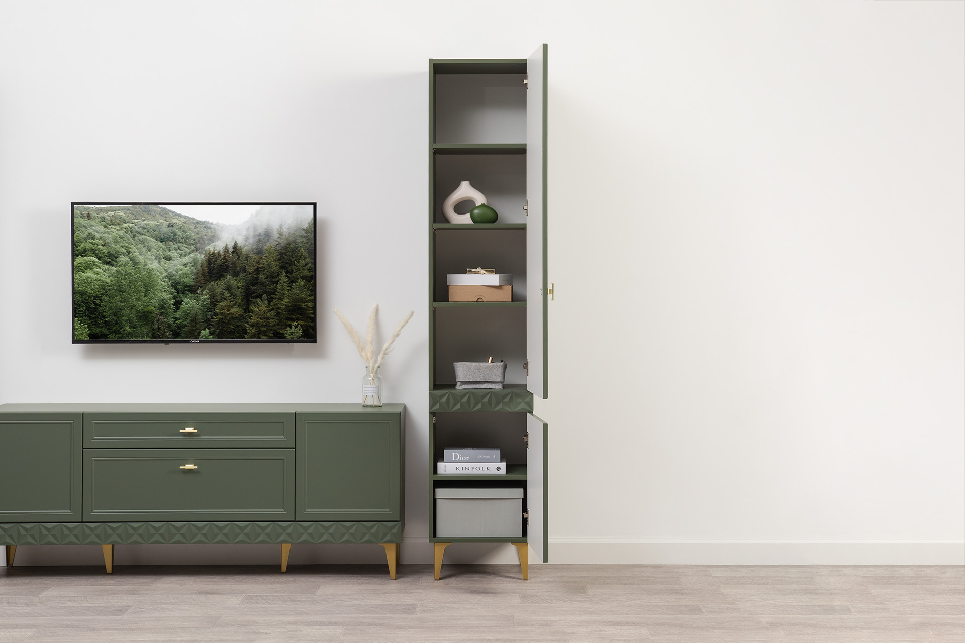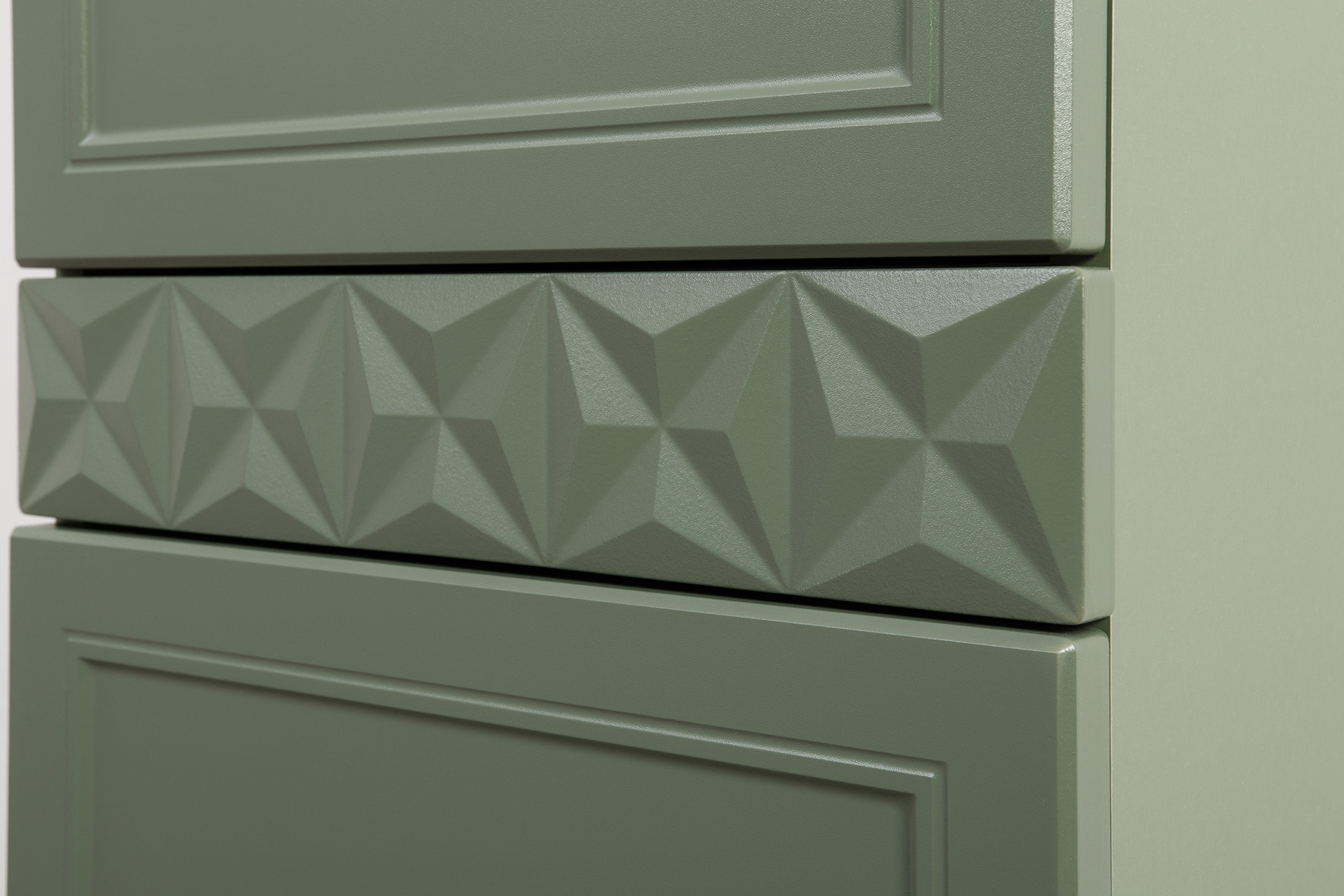 Изящные линии, глубокая фрезеровка фасадов из МДФ и благородные оттенки. Утончённая «Слоновая кость» и изысканная «Олива Шагрень» с глубоким зелёным тоном — создают атмосферу уюта, тепла и благородства. Металлические ручки и опоры золотого цвета придают мебели утончённый блеск, а петли и направляющие с доводчиками обеспечивают плавное и бесшумное закрытие фасадов.