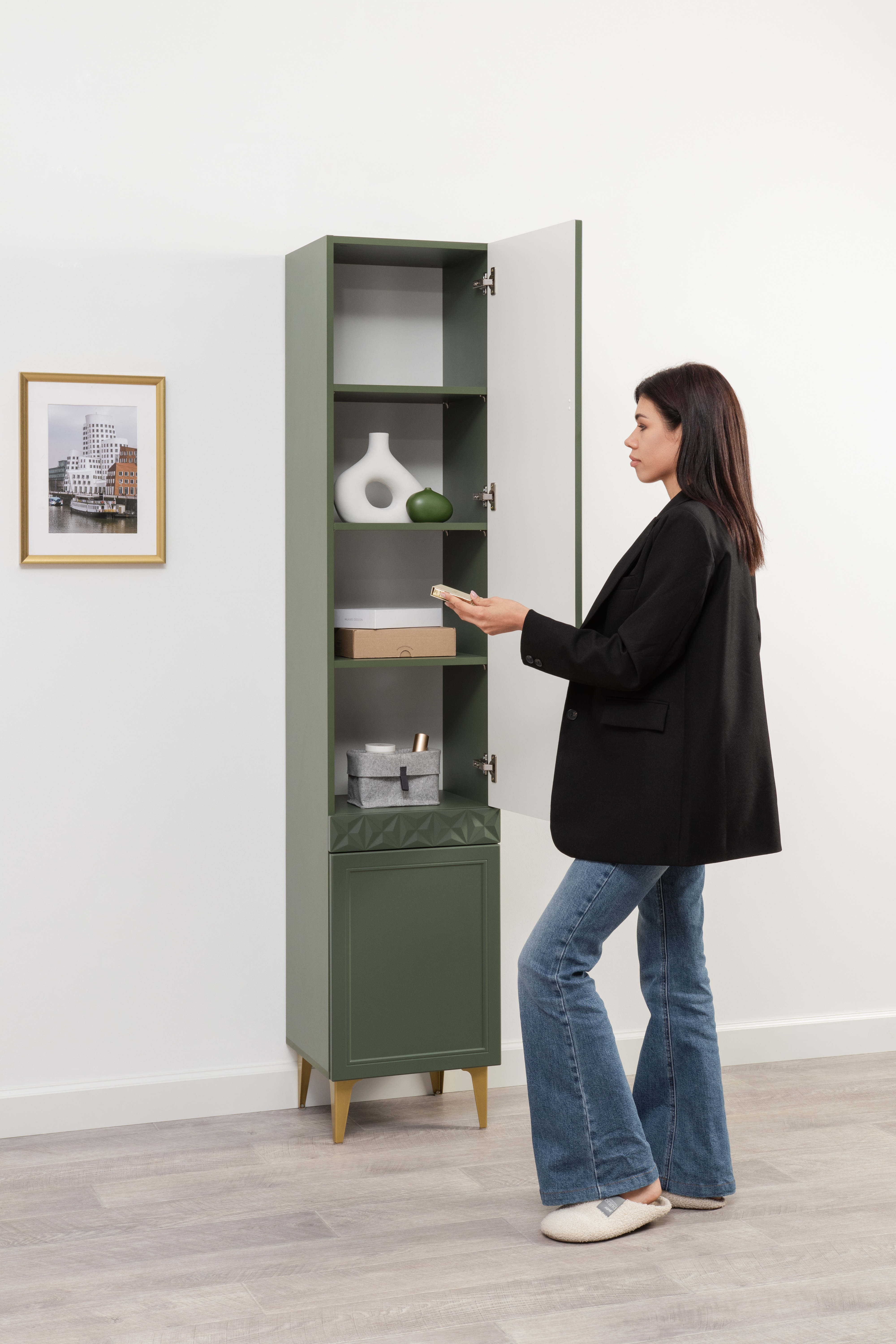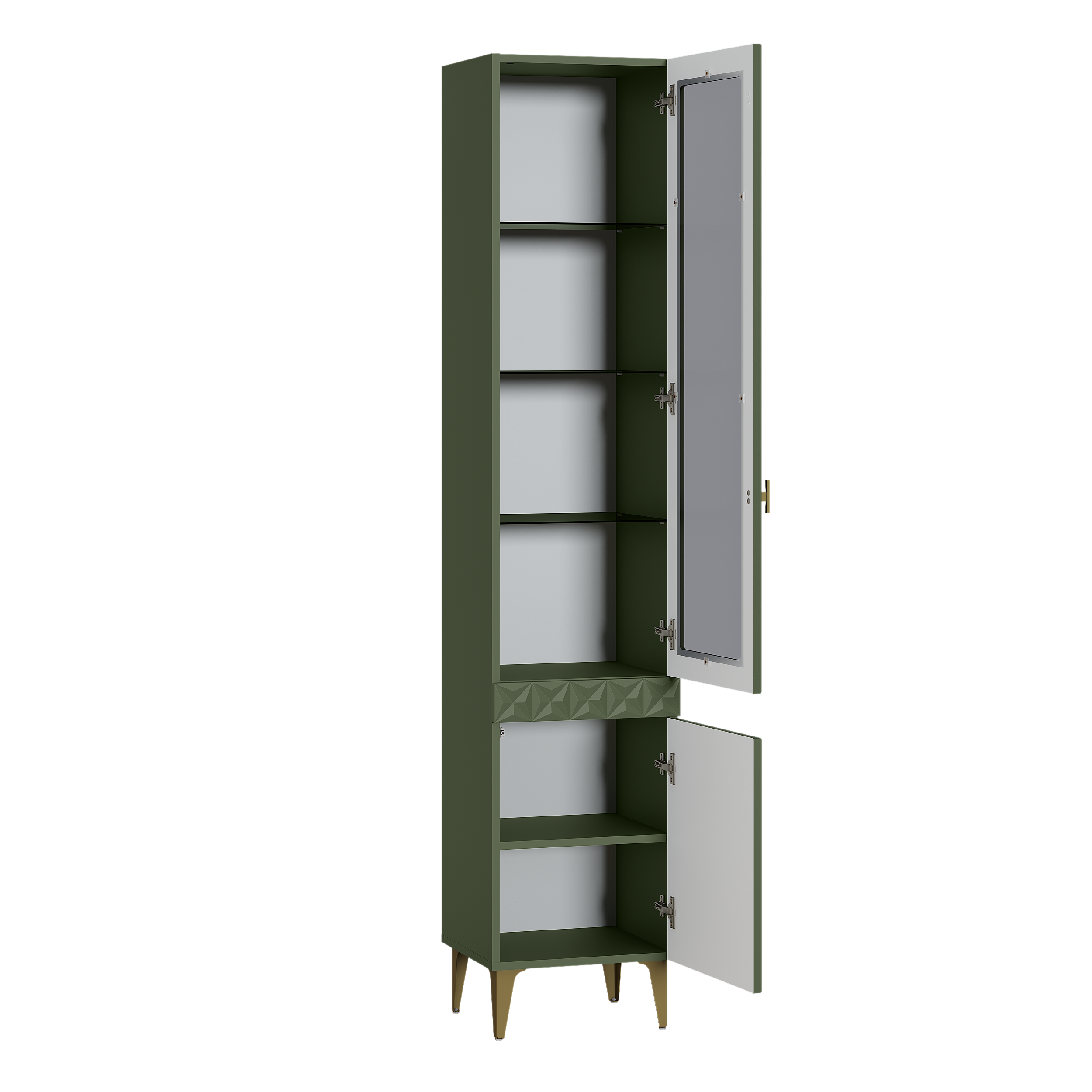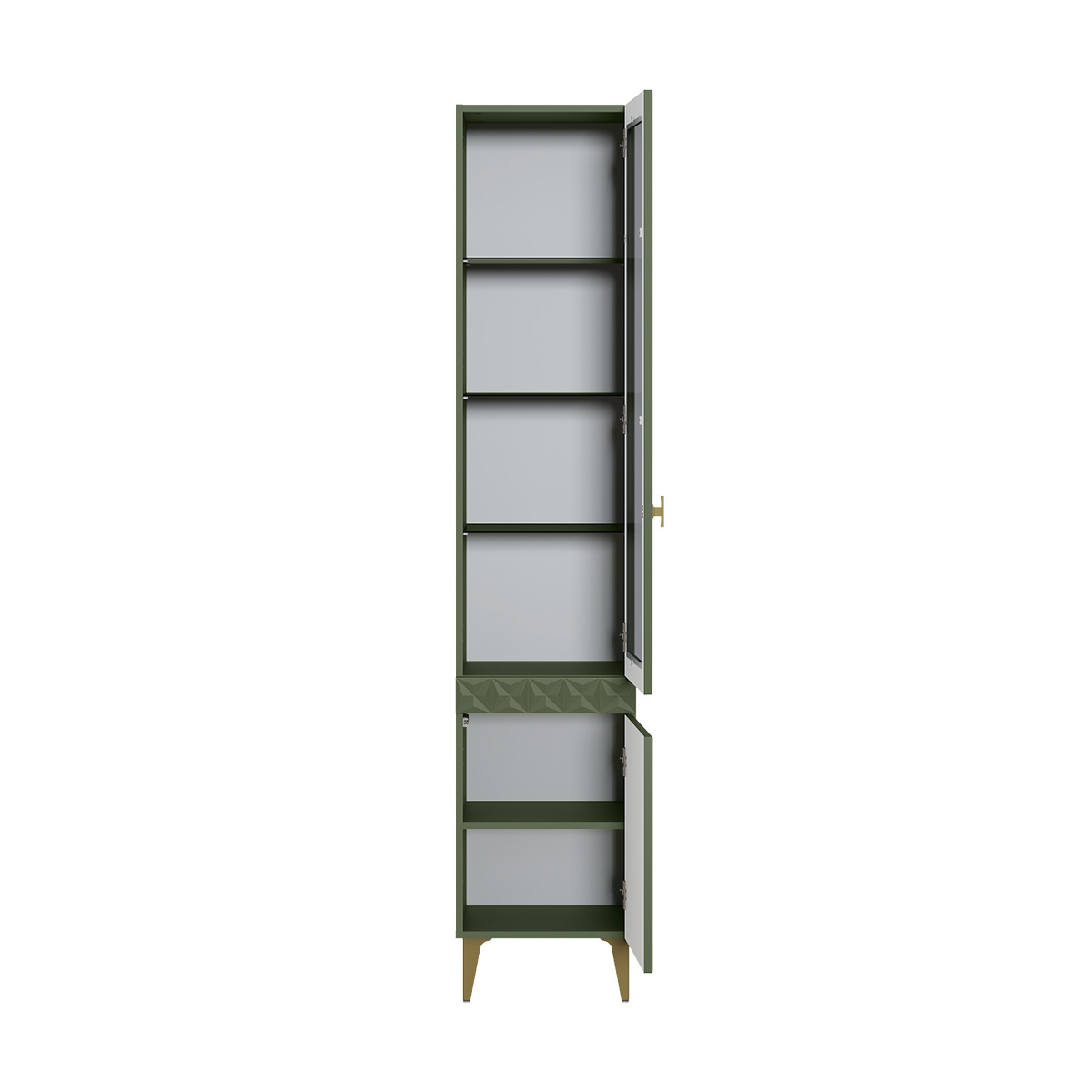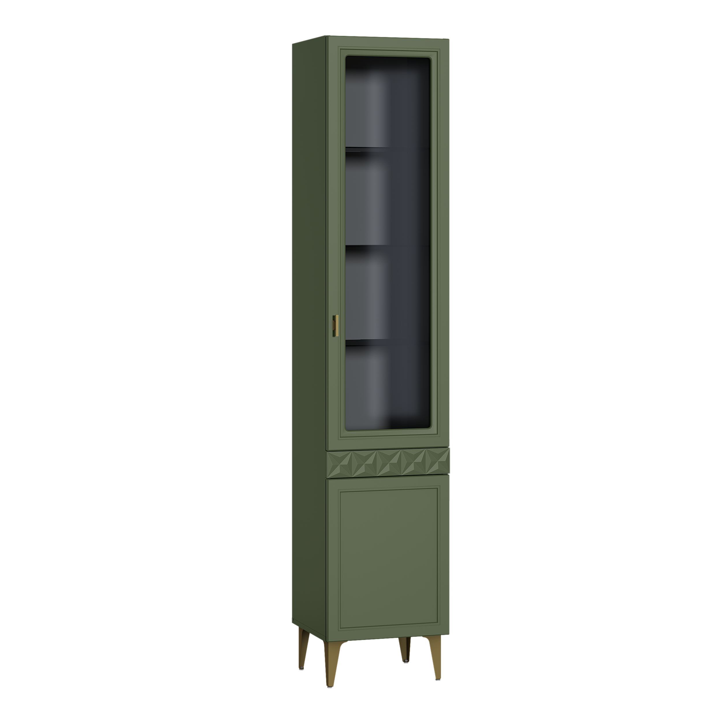 Изящные линии, глубокая фрезеровка фасадов из МДФ и благородные оттенки. Утончённая «Слоновая кость» и изысканная «Олива Шагрень» с глубоким зелёным тоном — создают атмосферу уюта, тепла и благородства. Металлические ручки и опоры золотого цвета придают мебели утончённый блеск, а петли и направляющие с доводчиками обеспечивают плавное и бесшумное закрытие фасадов.
