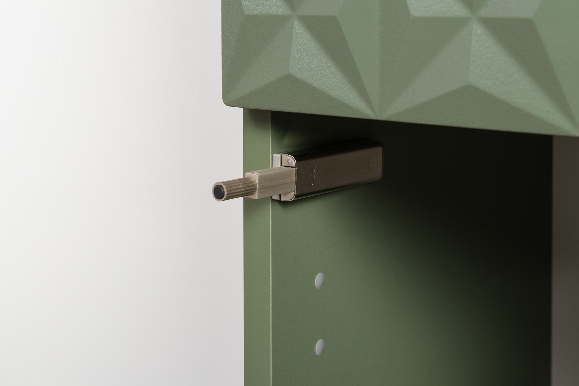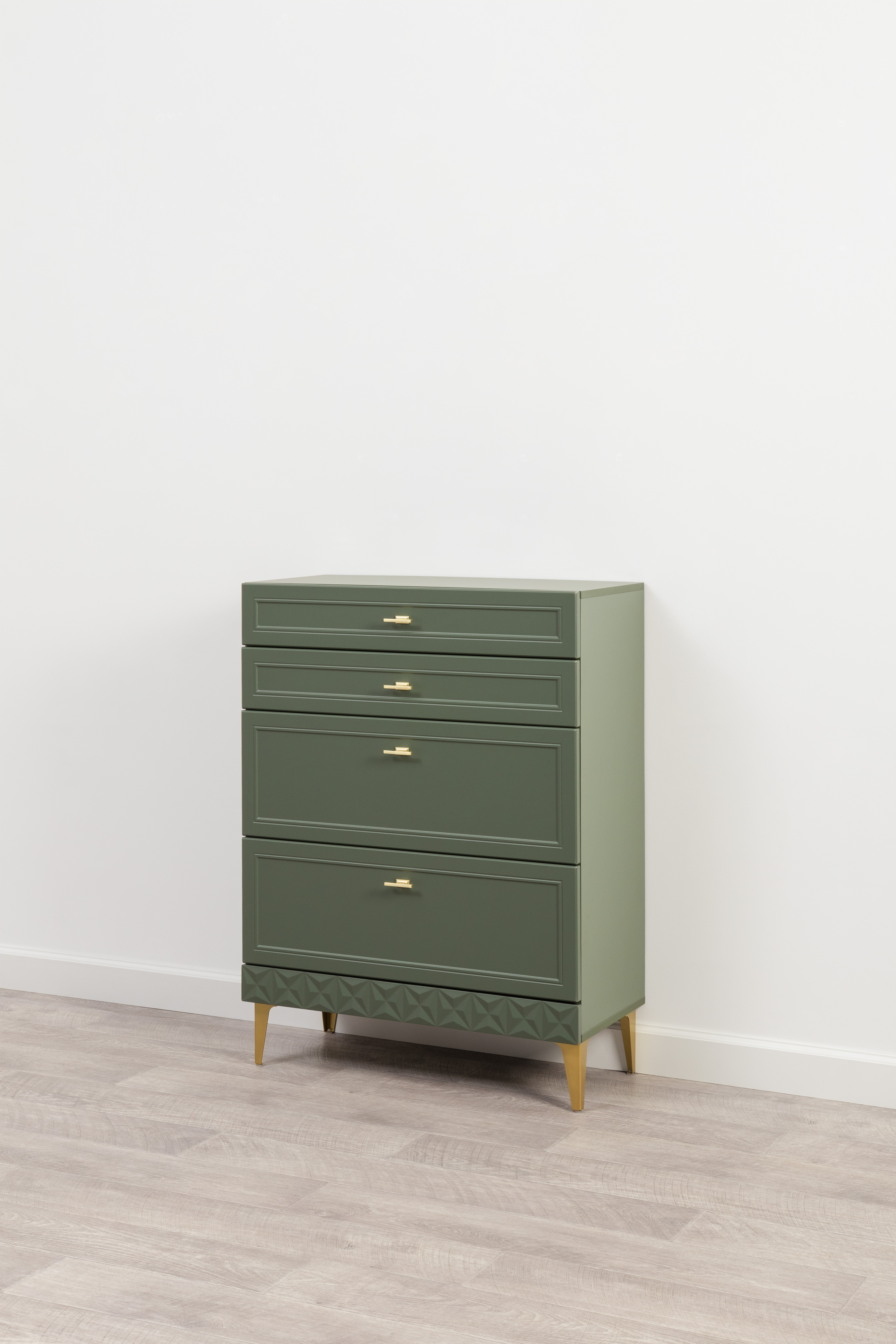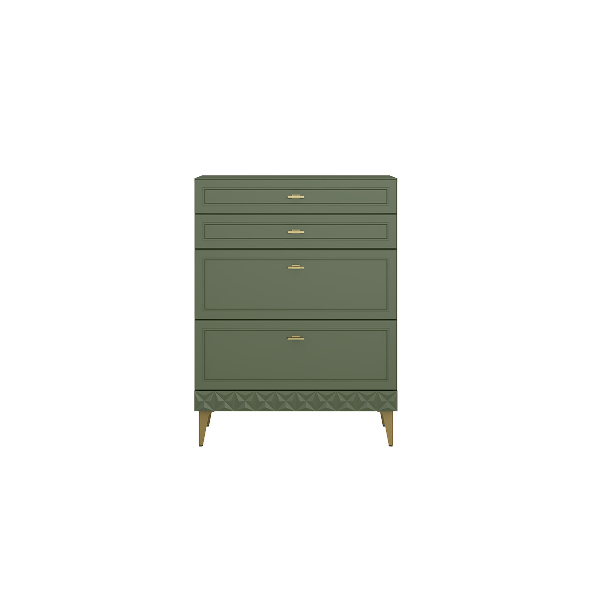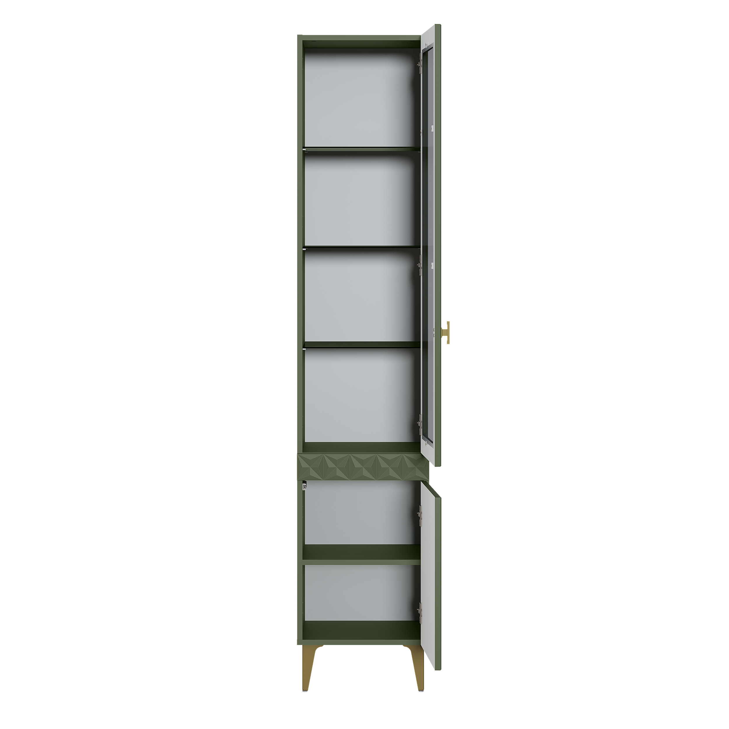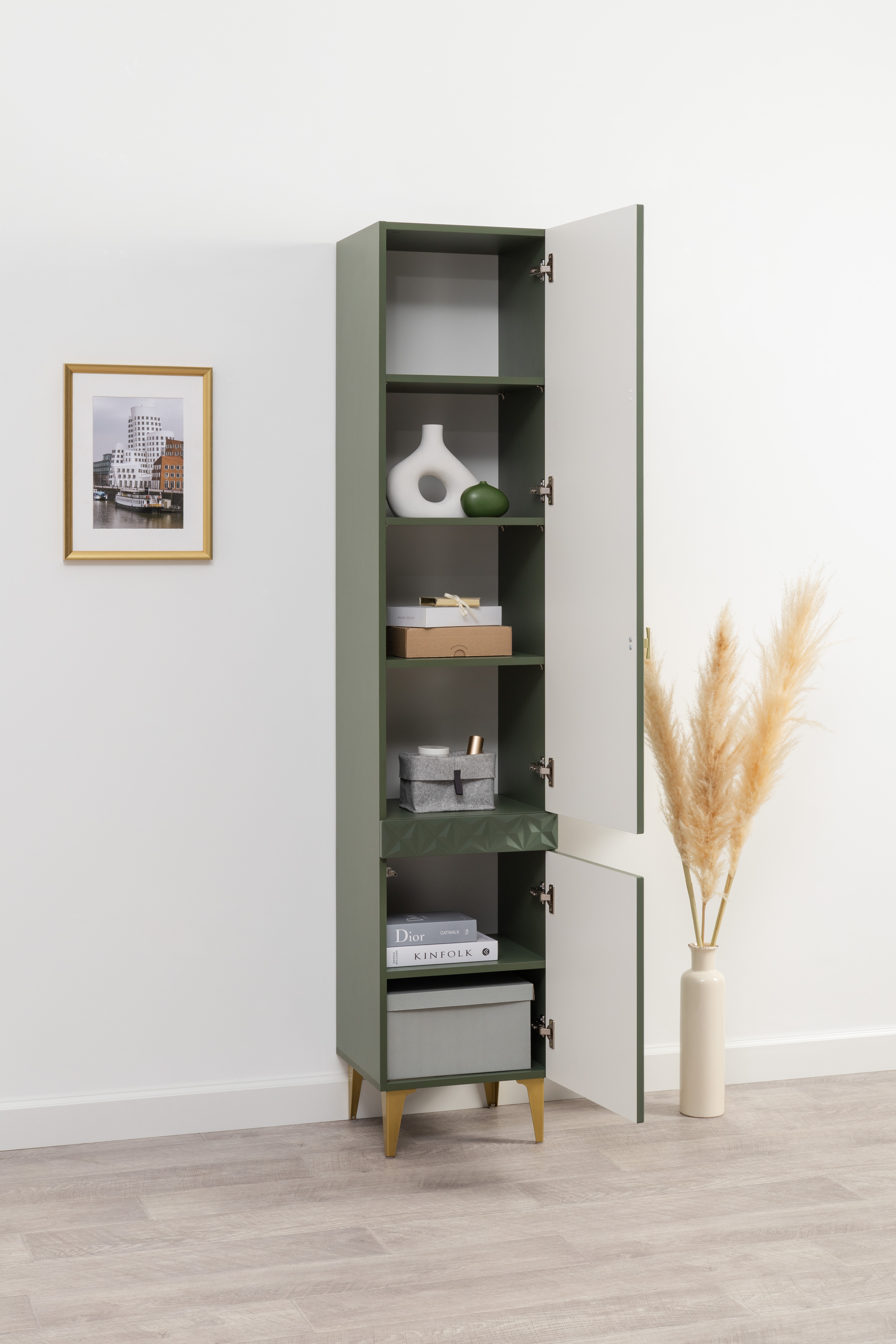 Изящные линии, глубокая фрезеровка фасадов из МДФ и благородные оттенки. Утончённая «Слоновая кость» и изысканная «Олива Шагрень» с глубоким зелёным тоном — создают атмосферу уюта, тепла и благородства. Металлические ручки и опоры золотого цвета придают мебели утончённый блеск, а петли и направляющие с доводчиками обеспечивают плавное и бесшумное закрытие фасадов.
