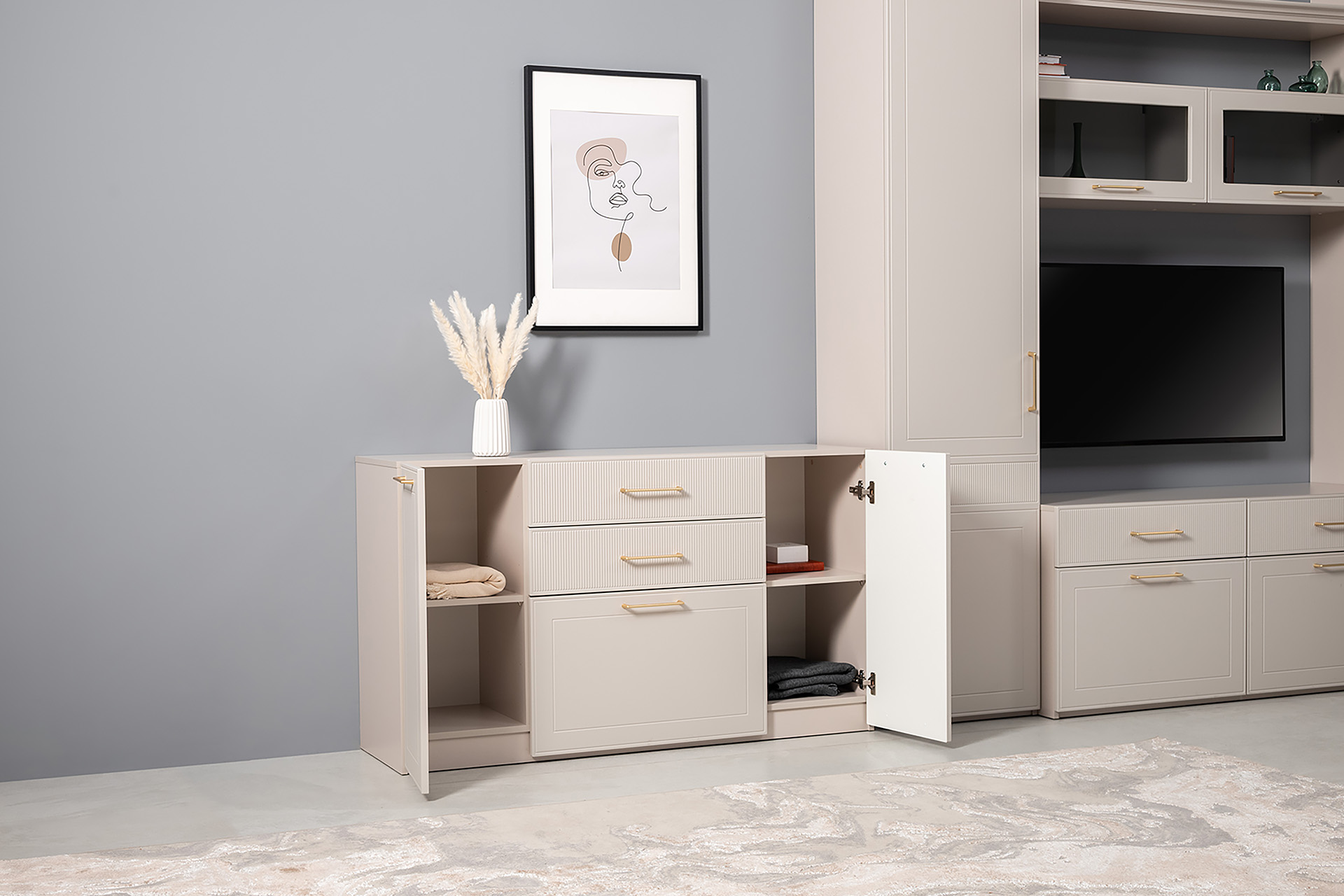 Гостиная Ричфорд композиция 2 без карнизов, кашемир 5981 BS, моно керамика D166-2 ПВХ, белый PE шагрень (собирается на любую сторону)