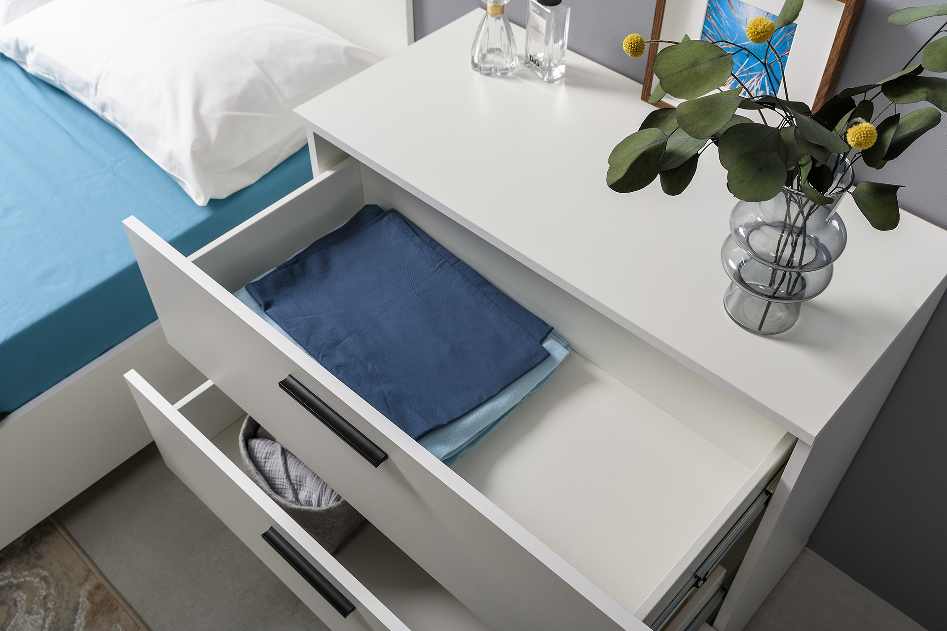 Два варианта кровати: ширина спального места 1200 и 1600 мм. Вместительный трёхстворчатый шкаф полноценной глубины с выдвижными ящиками и съемными полками. Ящики оснащены направляющими полного выдвижения.