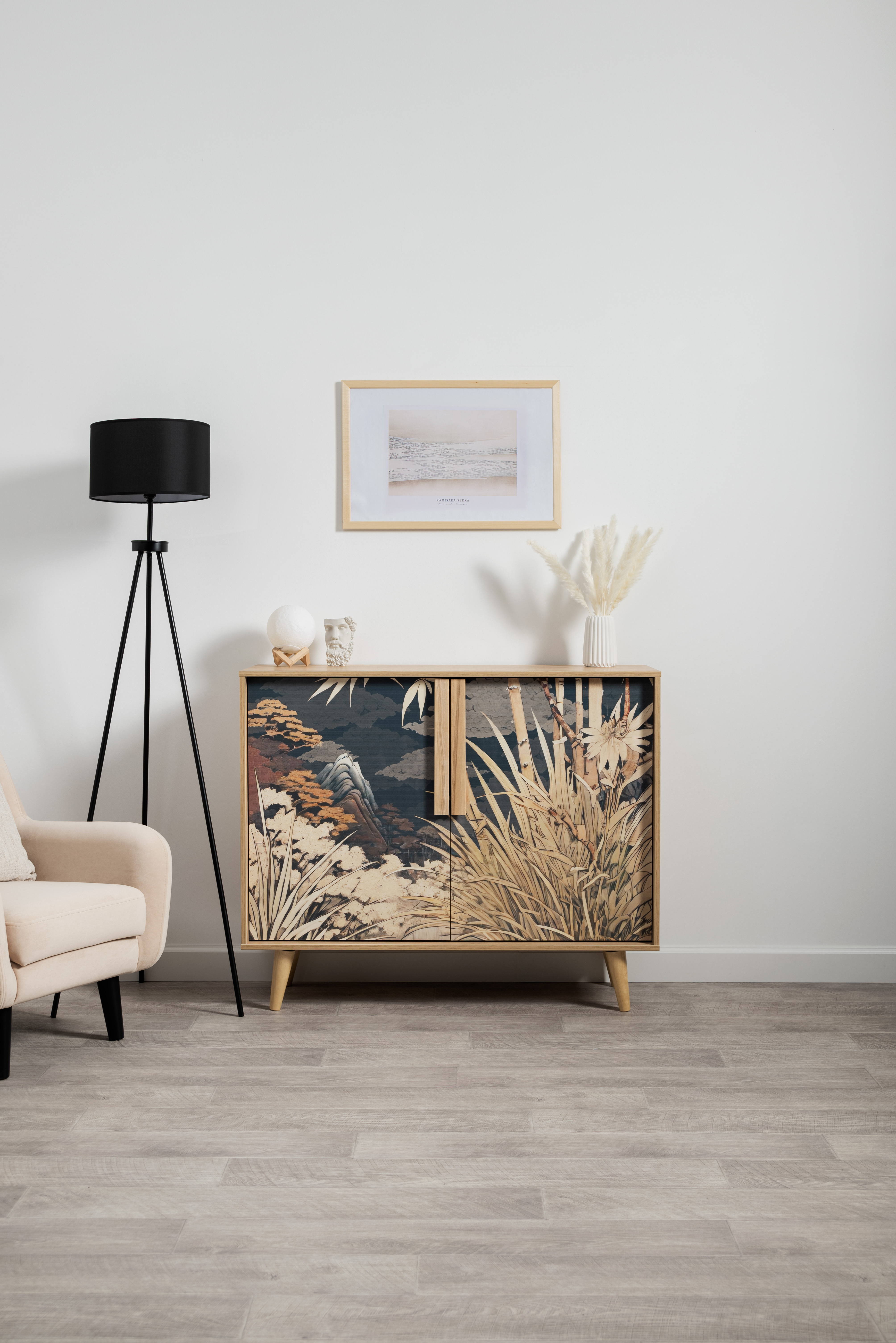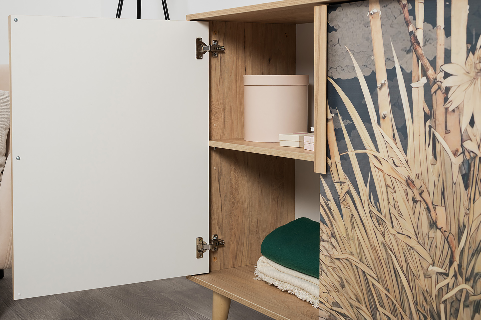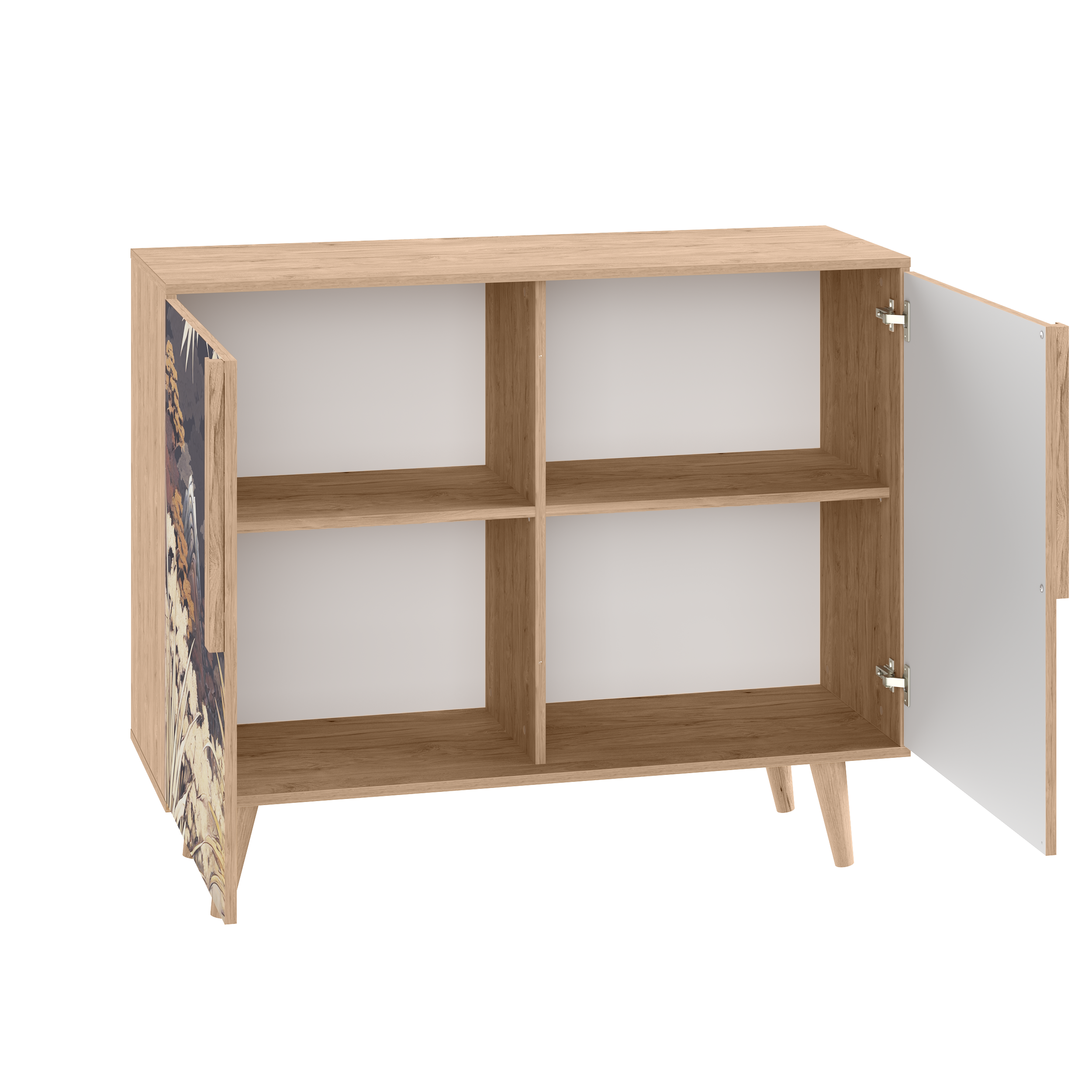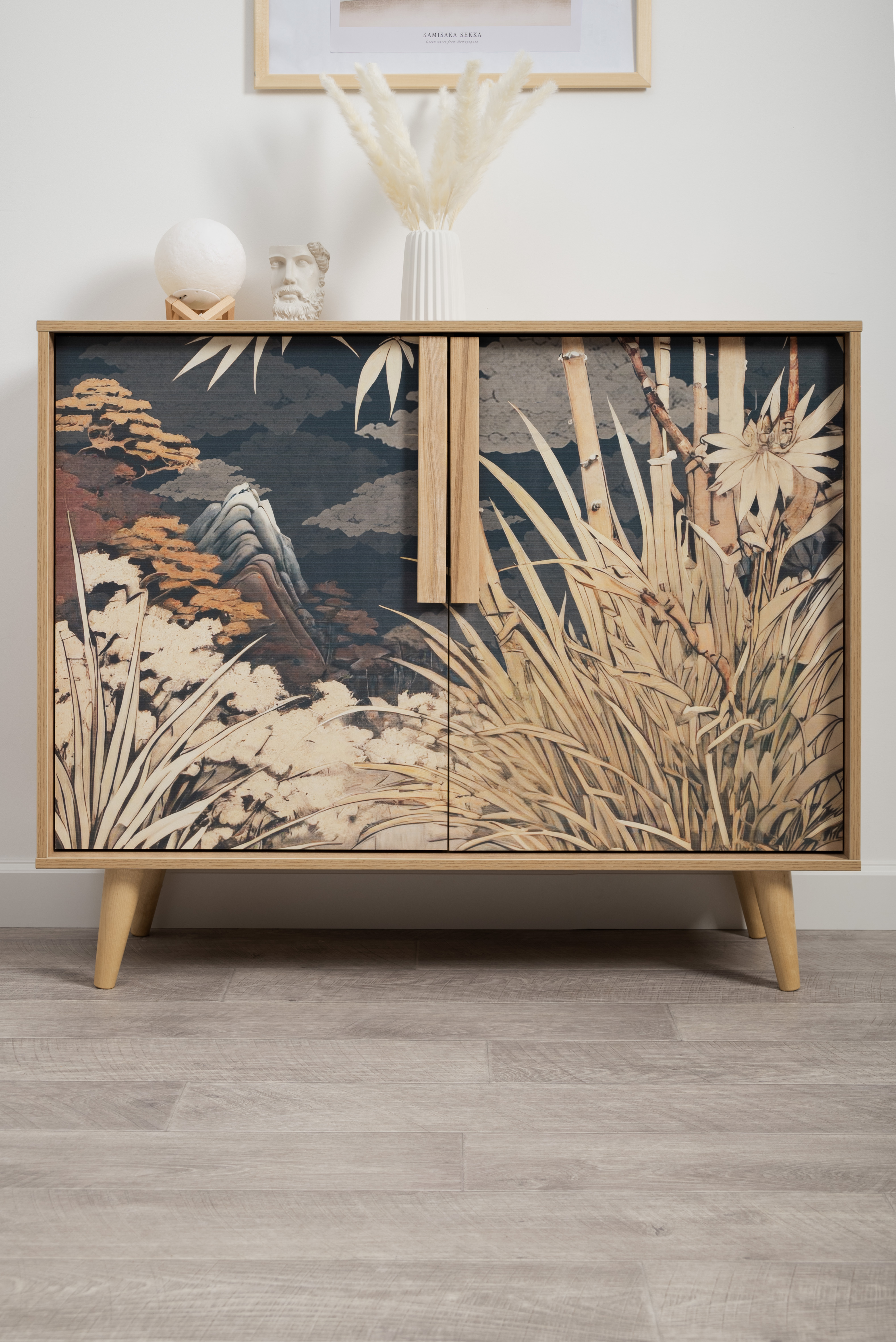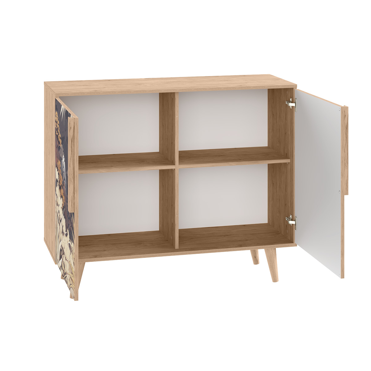 Комод Току 16.230.04 украшают фасады с фотопечатью в восточном стиле, и дополняют ручки и опоры из массива дерева. Вместительные отделения со съемными регулируемыми полками обеспечивают удобное хранение, а углубленные фасады придают конструкции стильную глубину.