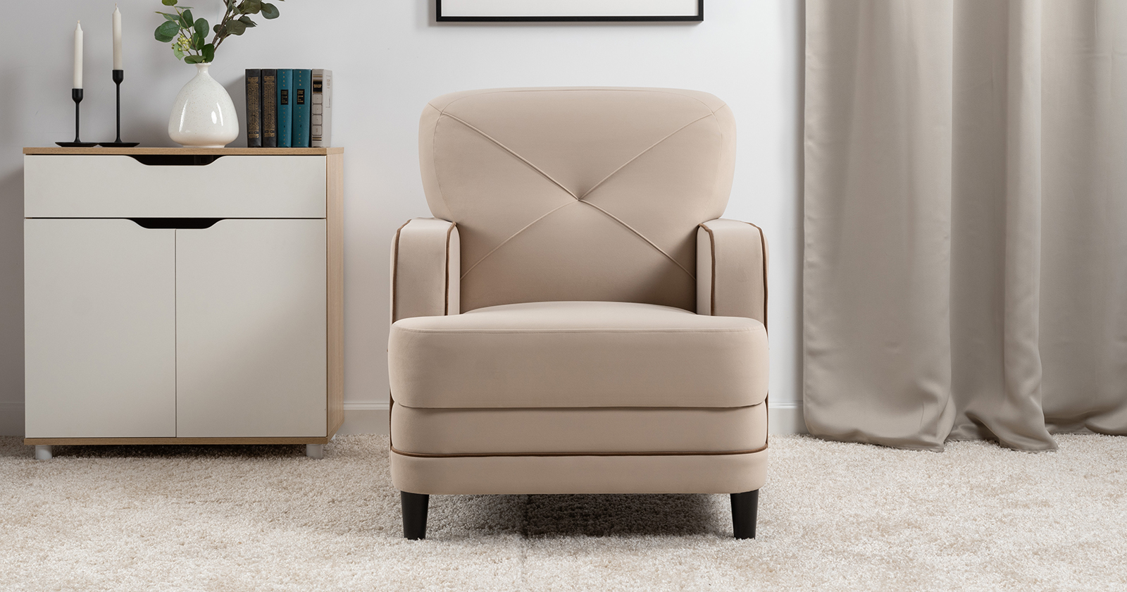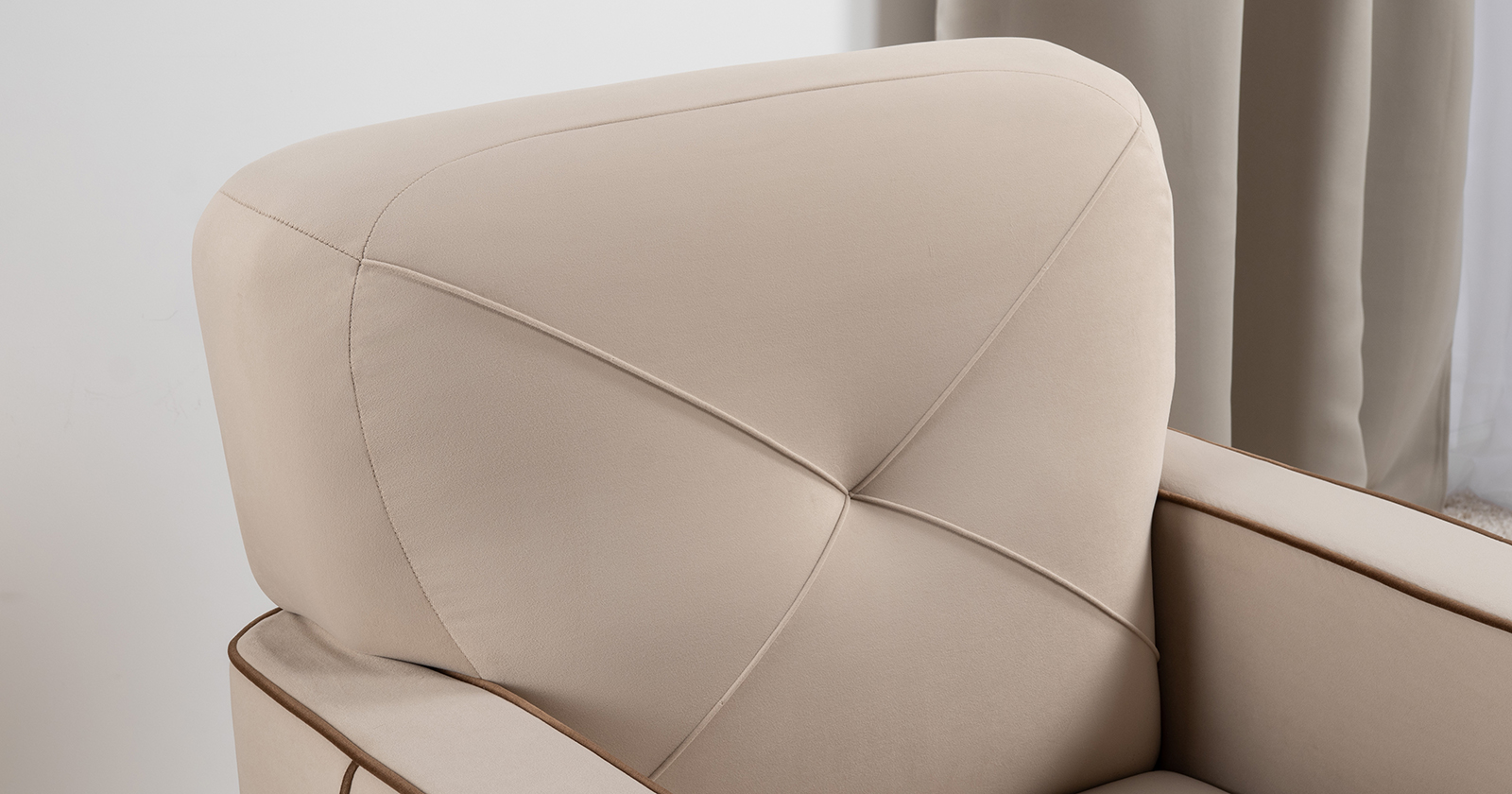 Декоративные канты на вставке подлокотников. Пуговицы в местах пересечения кантов на подушке и вставке подлокотников. По торцам подлокотников и думках контрастный декоративный кант. Защипы на сиденье и подушке.
