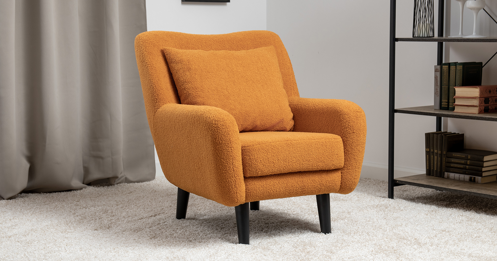 Ткань букле делает кресло особенно уютным и мягким. Приспинная подушка в цвете кресла