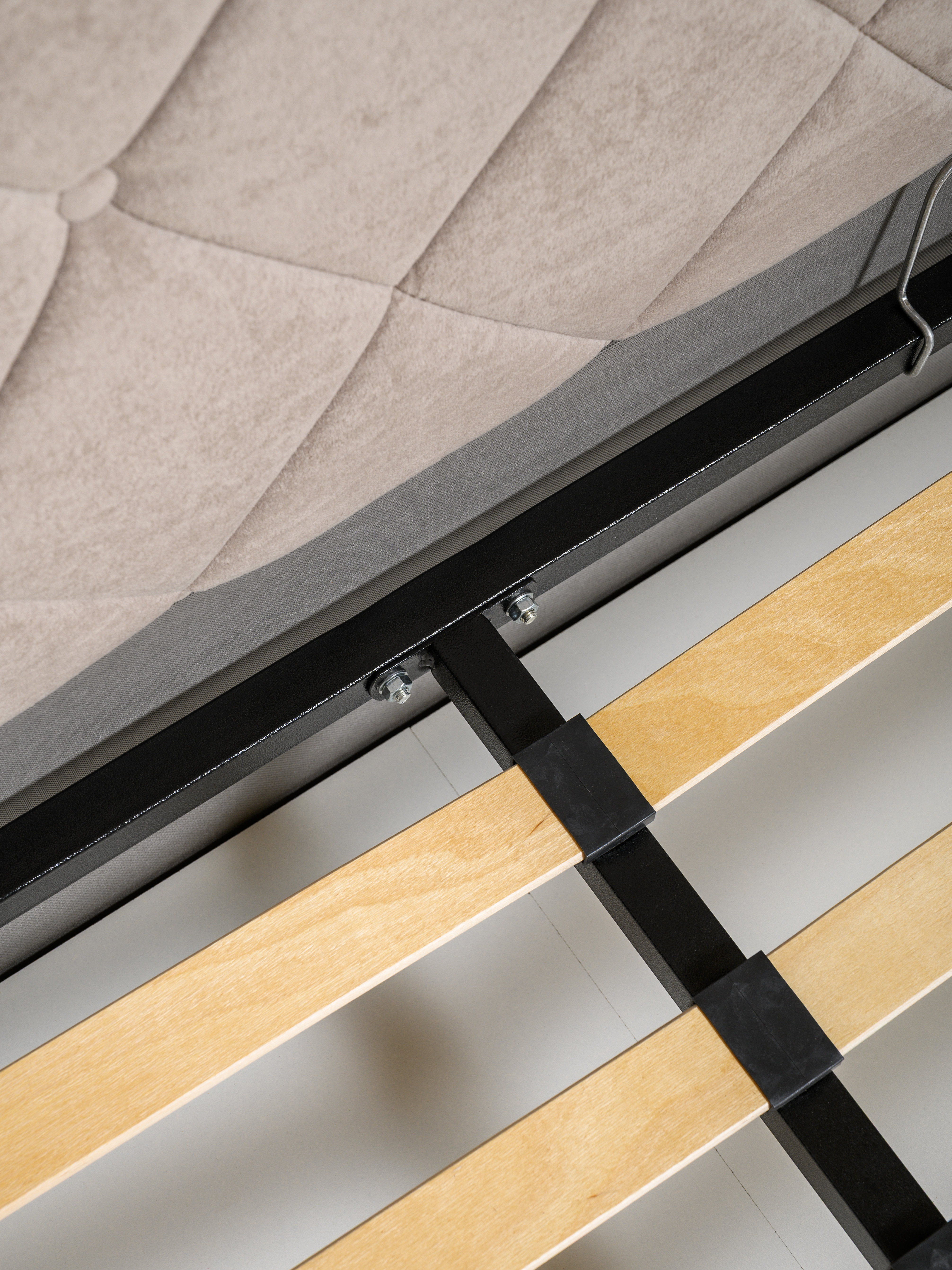 Основание кровати укомплектовано матрасодержателями. Жесткое кроватное дно из ЛДСП 16 мм на опорах 25 мм.
