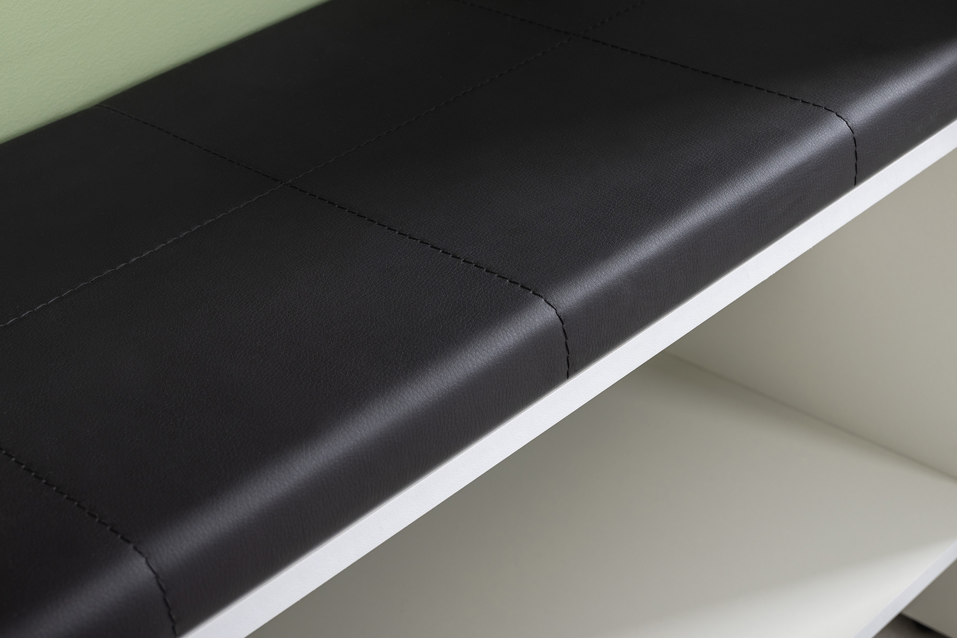 Вместительный шкаф полноразмерной глубины можно дополнить тумбой для обуви с мягким сиденьем и нишами для хранения, зеркалом и минималистичными вешалками.