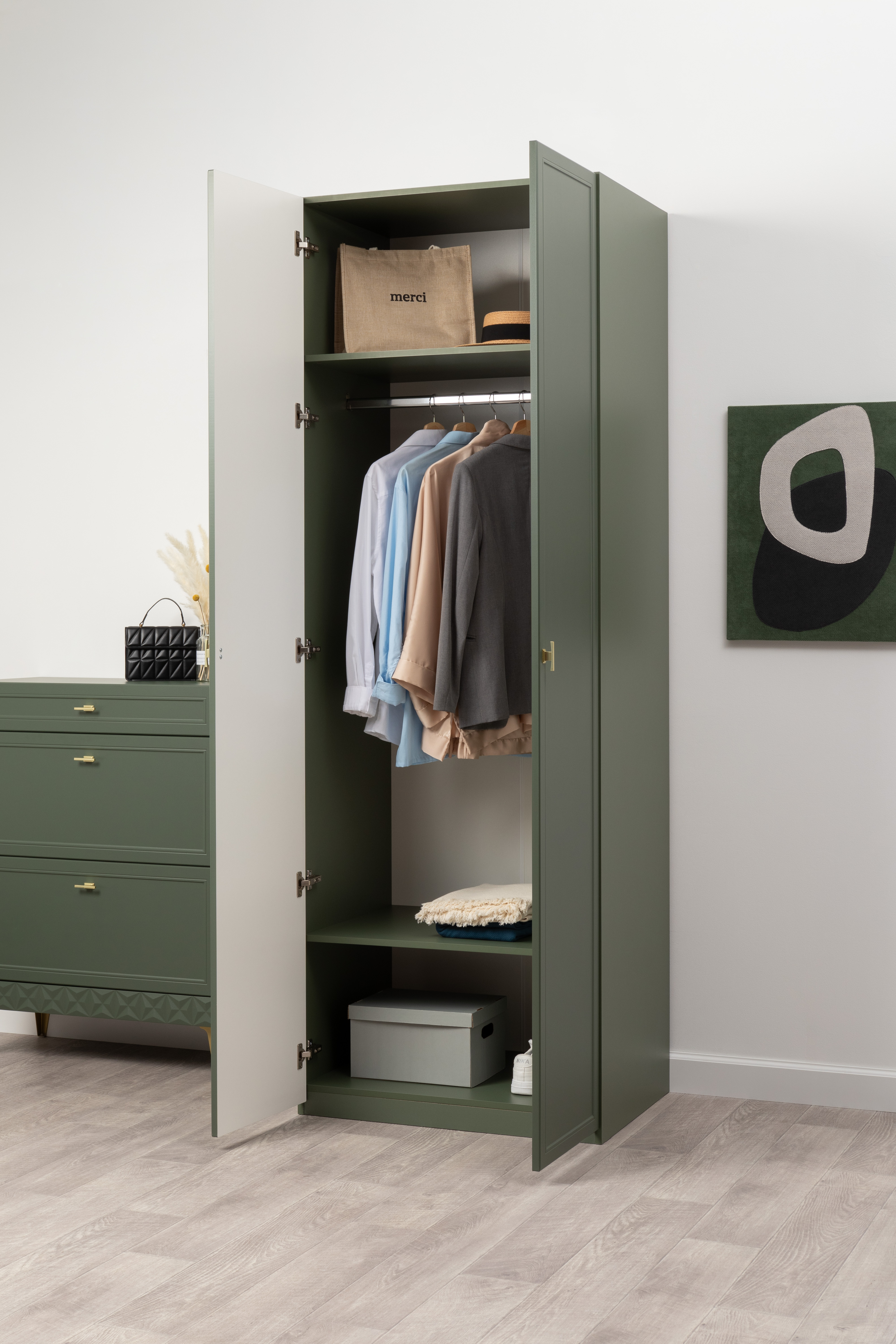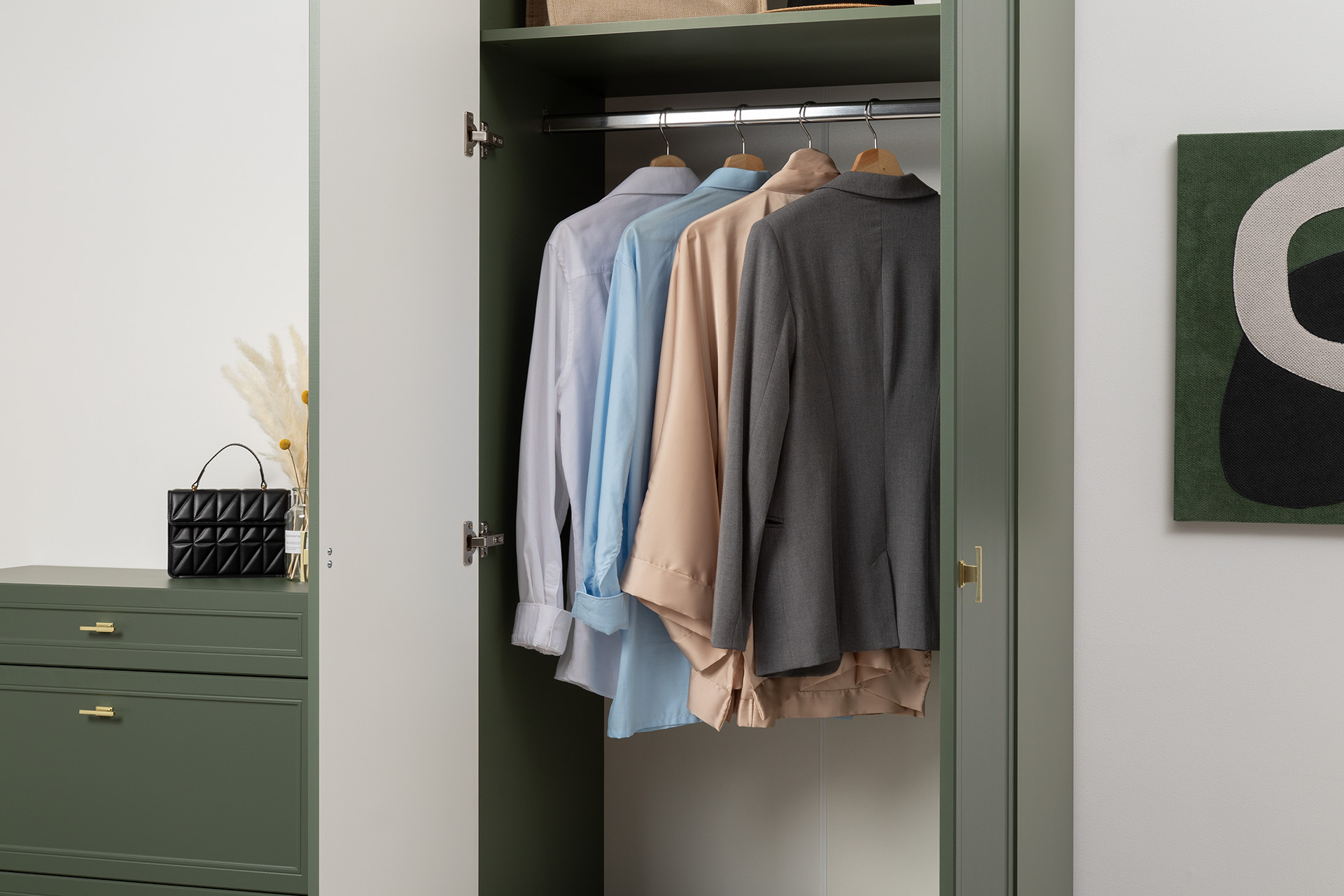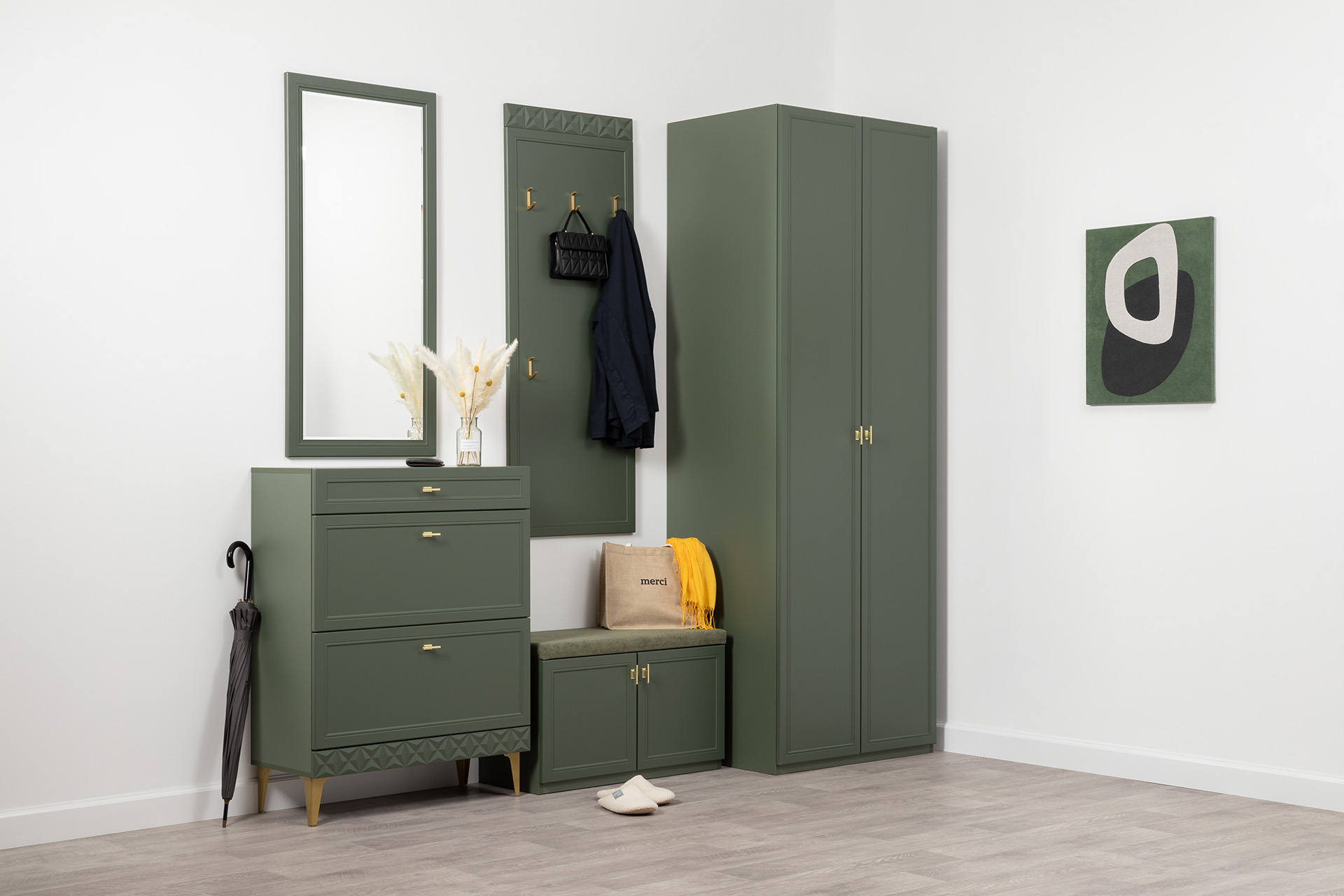 Изящные линии, глубокая фрезеровка фасадов из МДФ и благородные оттенки. Утончённая «Слоновая кость» и изысканная «Олива Шагрень» с глубоким зелёным тоном — создают атмосферу уюта, тепла и благородства. Металлические ручки и опоры золотого цвета придают мебели утончённый блеск, а петли и направляющие с доводчиками обеспечивают плавное и бесшумное закрытие фасадов.