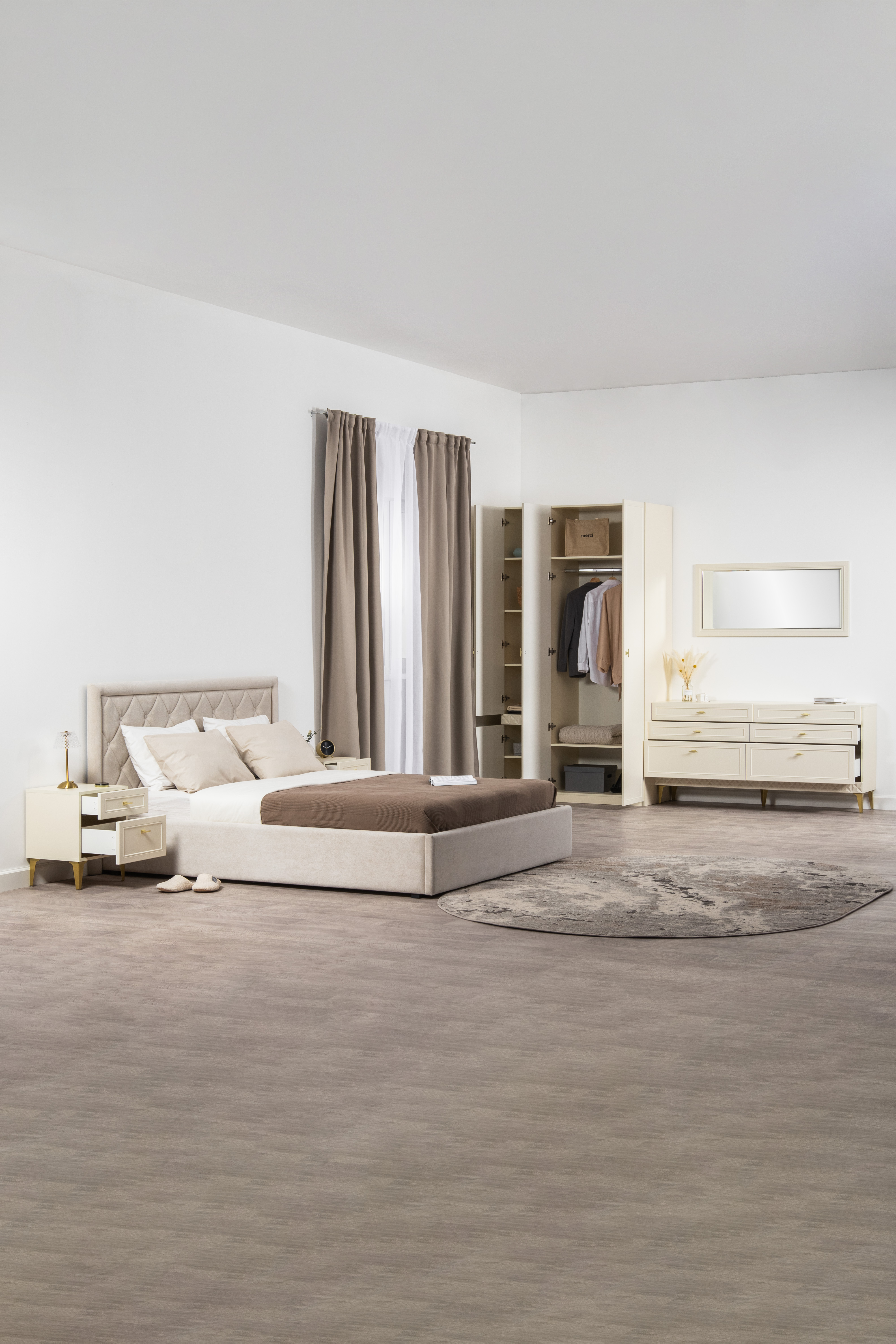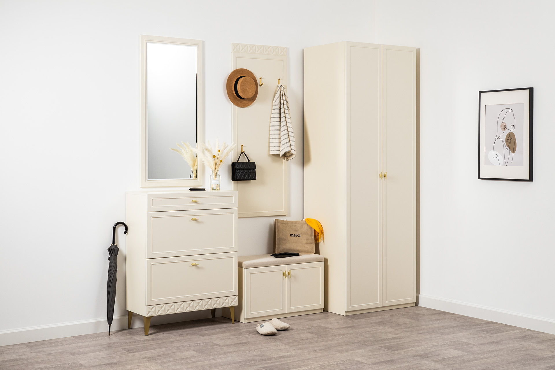 Изящные линии, глубокая фрезеровка фасадов из МДФ и благородные оттенки. Утончённая «Слоновая кость» и изысканная «Олива Шагрень» с глубоким зелёным тоном — создают атмосферу уюта, тепла и благородства. Металлические ручки и опоры золотого цвета придают мебели утончённый блеск, а петли и направляющие с доводчиками обеспечивают плавное и бесшумное закрытие фасадов.