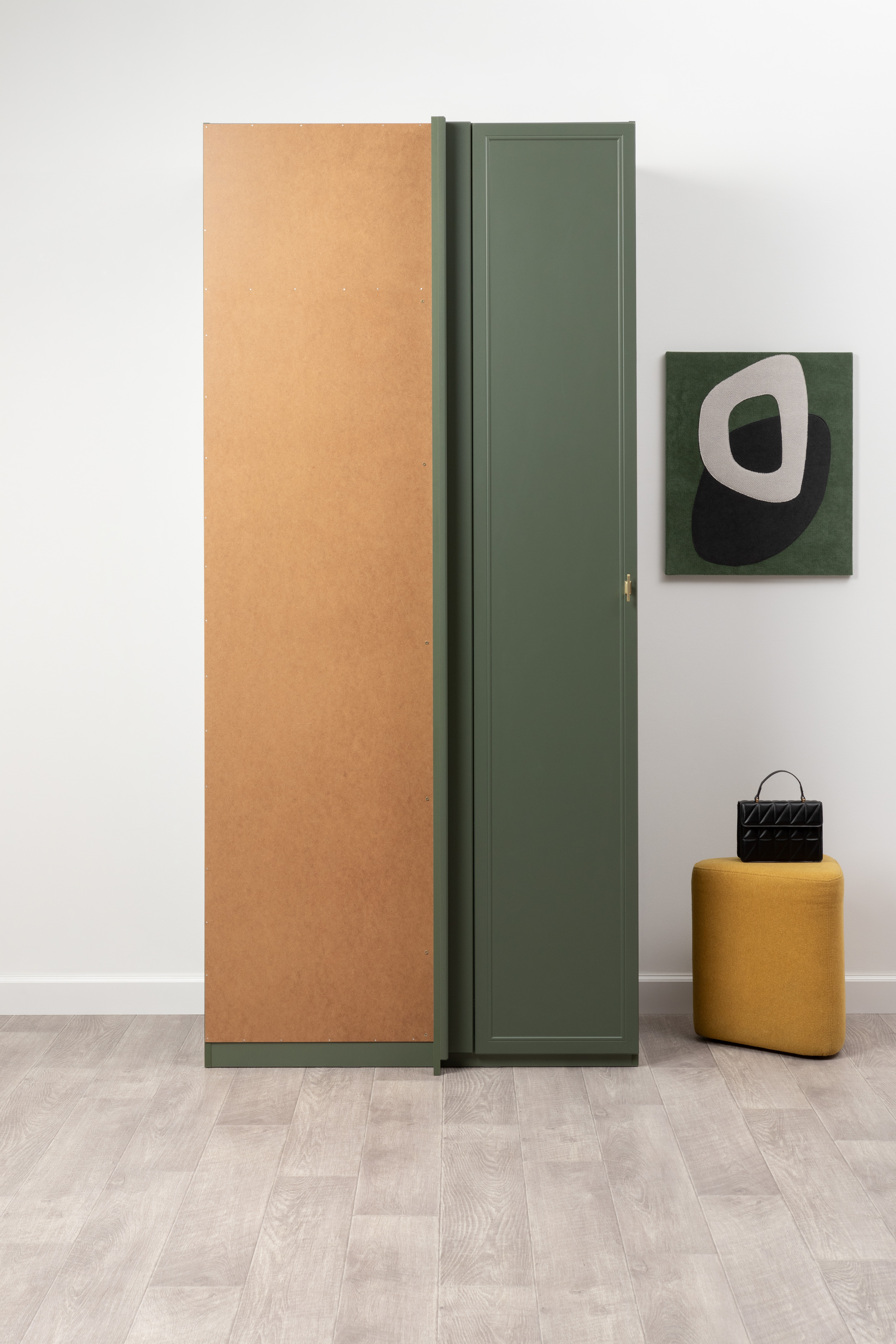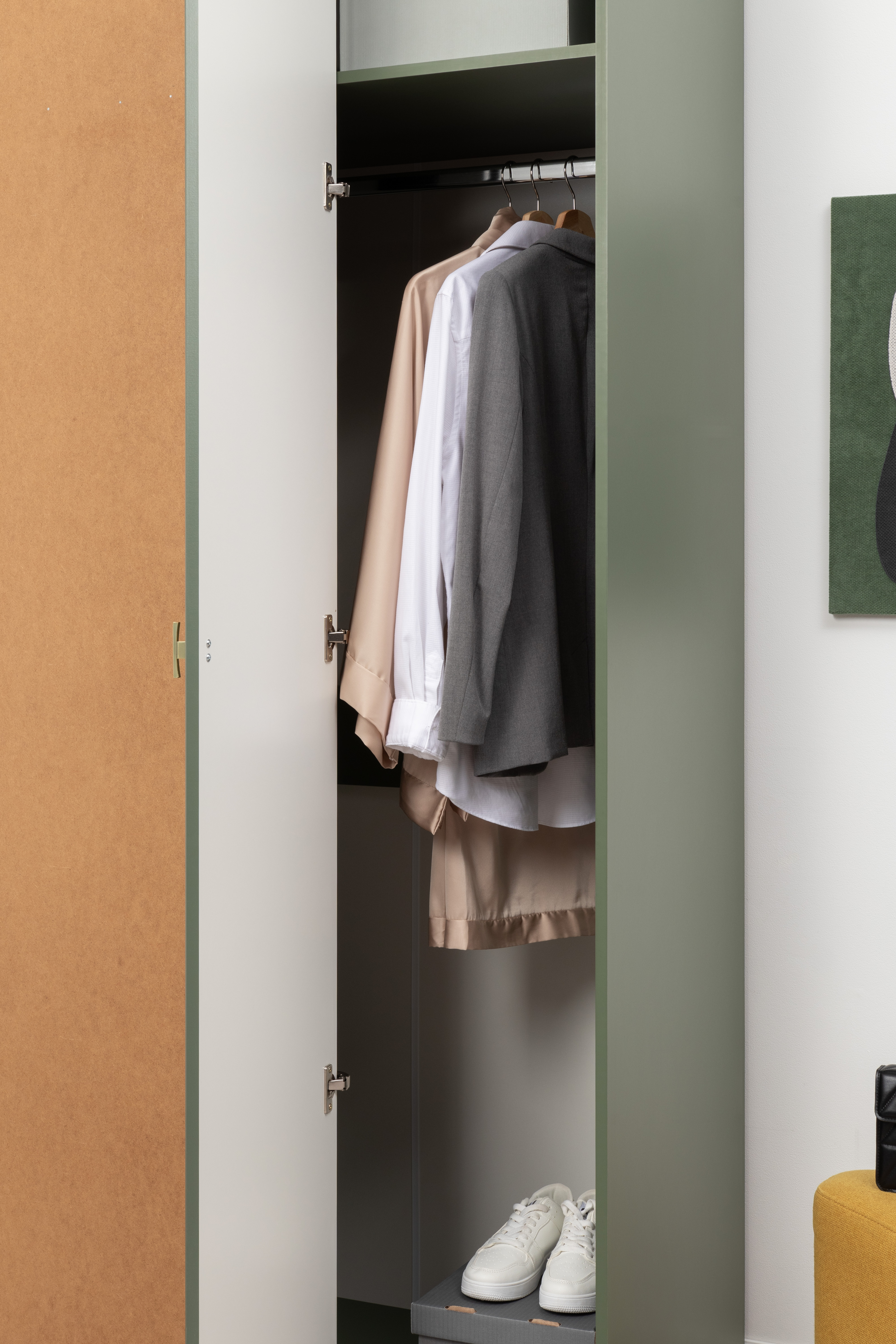 Изящные линии, глубокая фрезеровка фасадов из МДФ и благородные оттенки. Утончённая «Слоновая кость» и изысканная «Олива Шагрень» с глубоким зелёным тоном — создают атмосферу уюта, тепла и благородства. Металлические ручки и опоры золотого цвета придают мебели утончённый блеск, а петли и направляющие с доводчиками обеспечивают плавное и бесшумное закрытие фасадов.