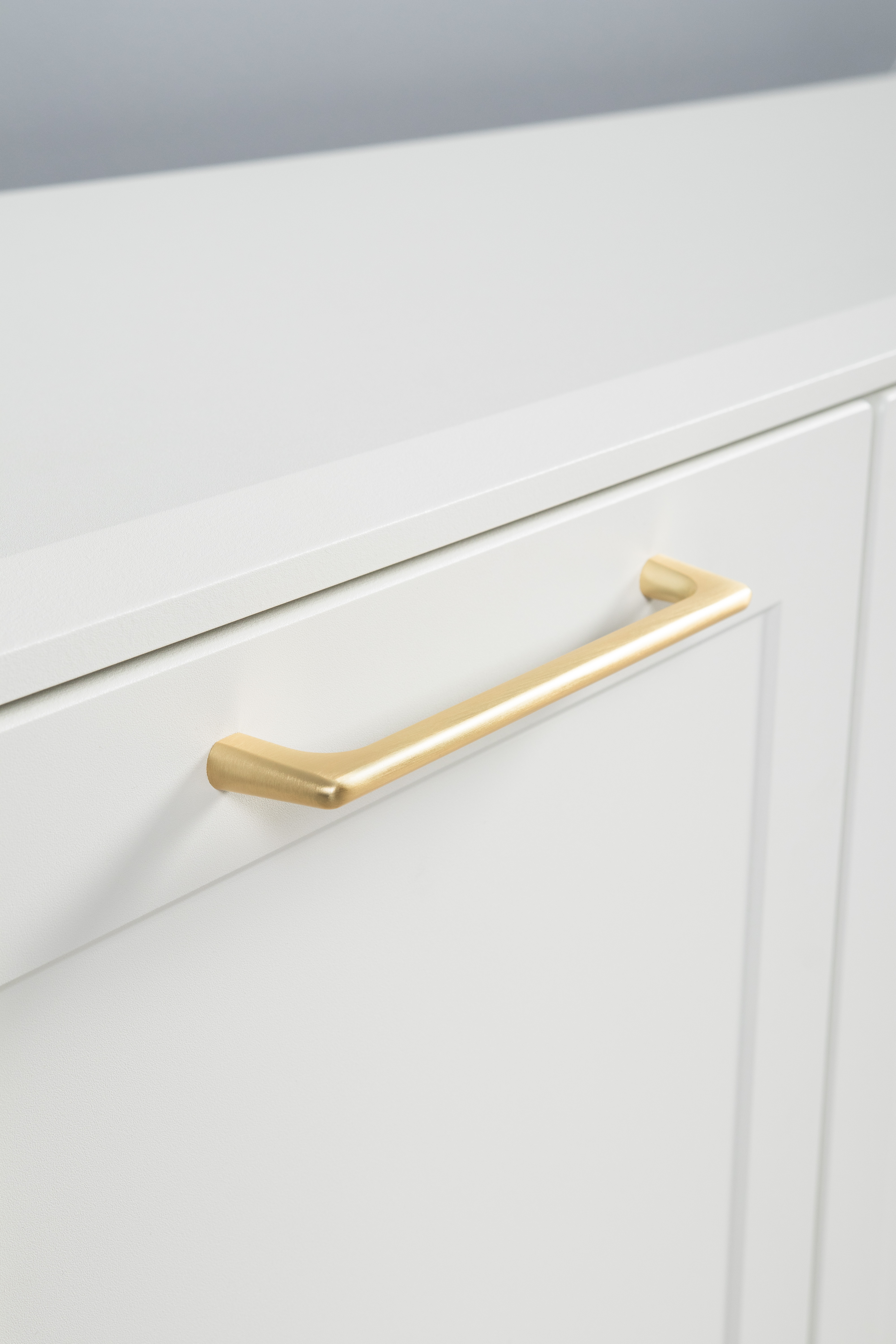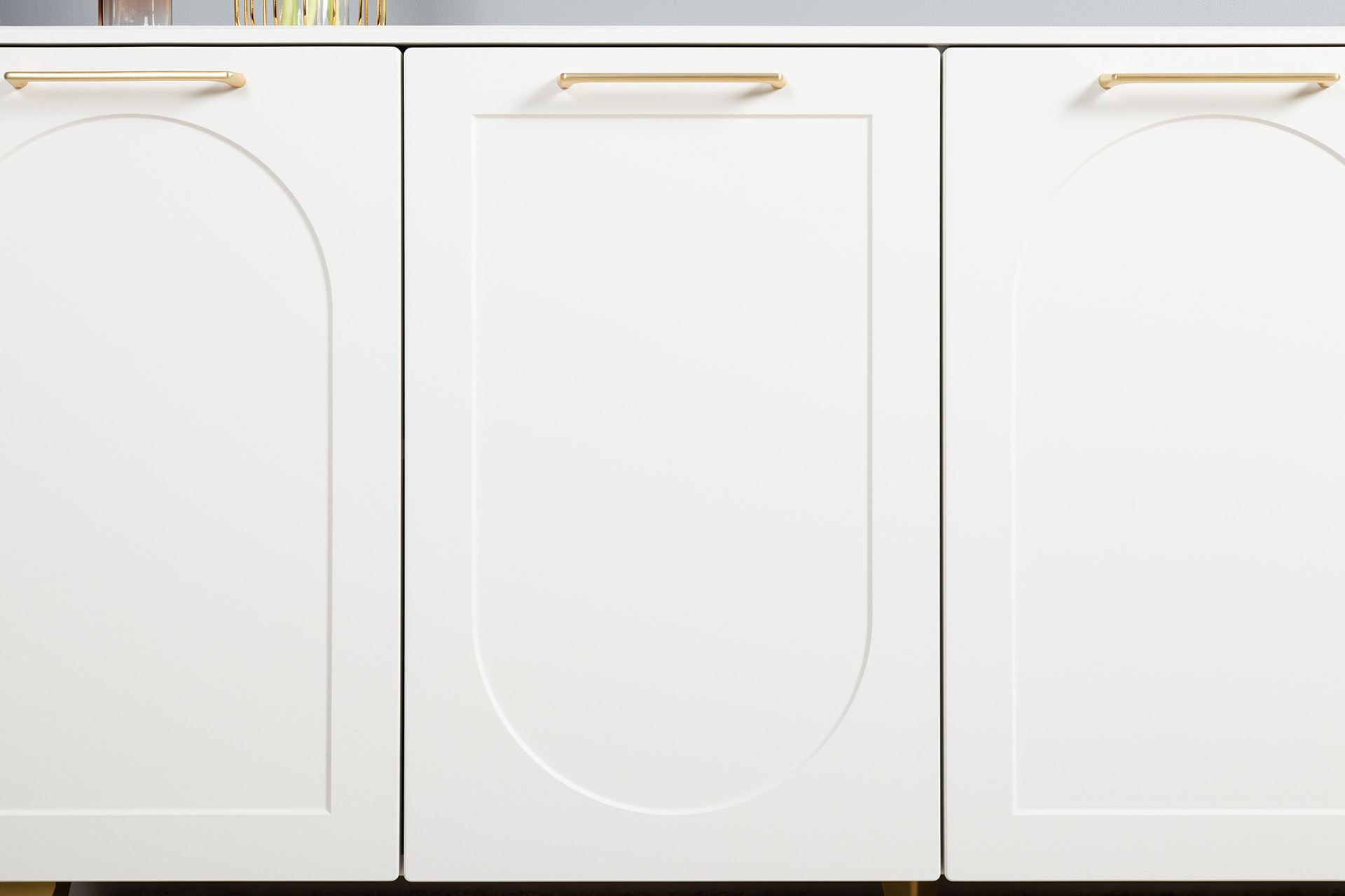 Фасады МДФ с фрезеровкой и верхняя крышка из МДФ сочетаются с металлическими ручками и опорами, создавая притягательный акцент в интерьере.