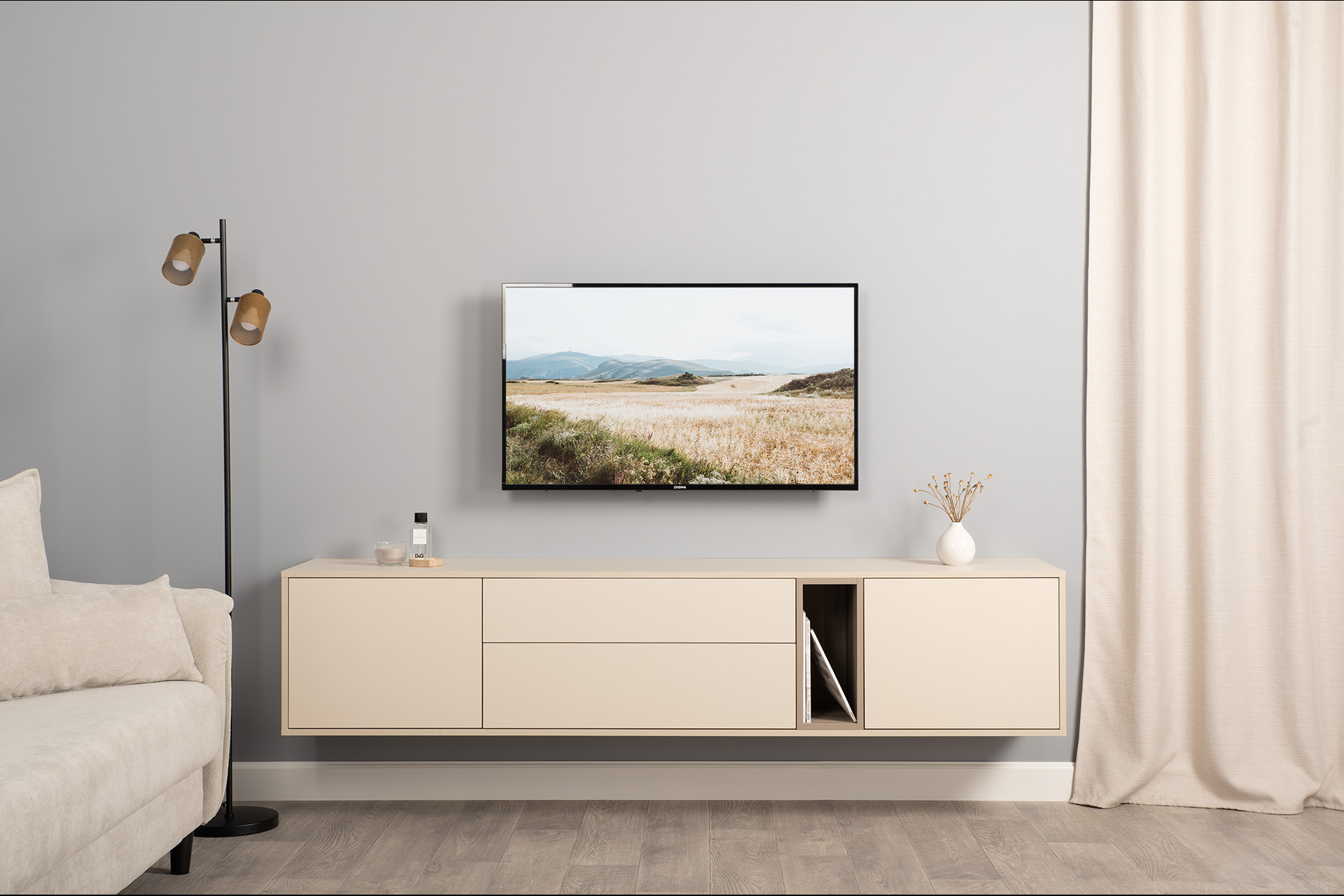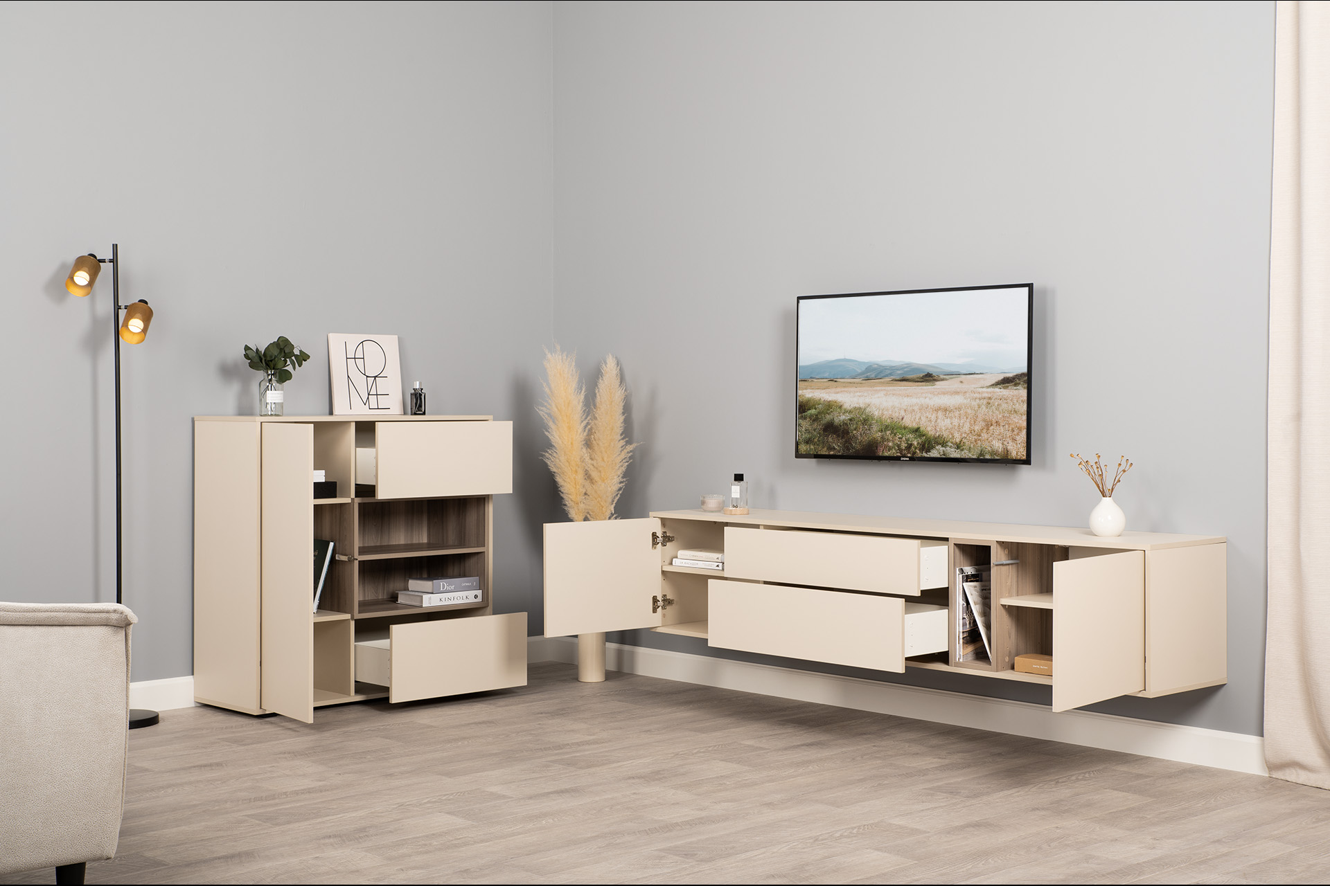 Тумба под ТВ в гостиную Петра 13.281 белый PE шагрень, милк софт ПВХ, бетон чикаго беж ПВХ